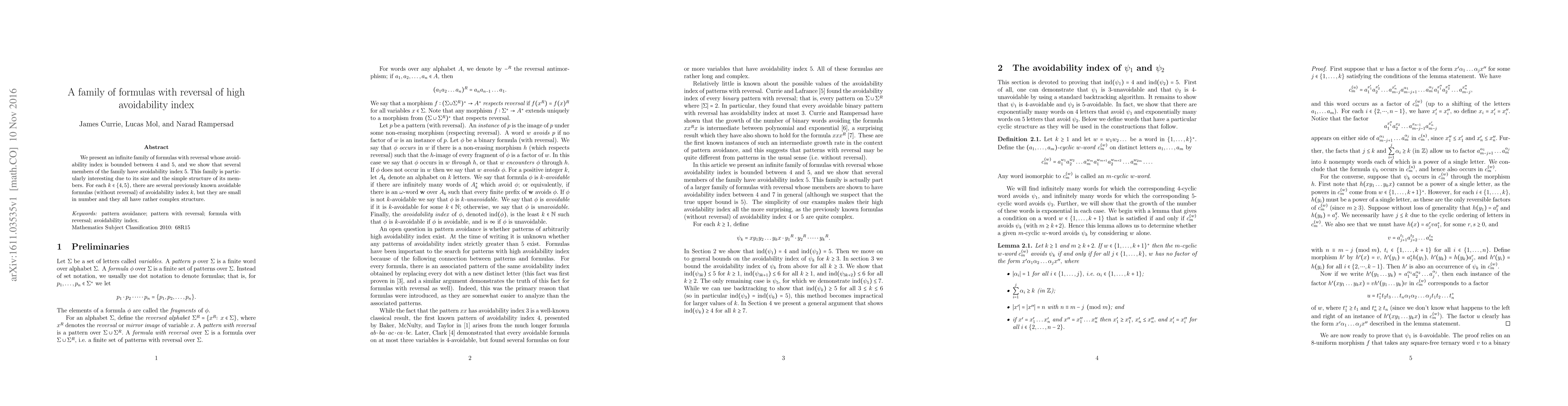 This paper introduces an infinite family of formulas with reversal, demonstrating that their avoidability index ranges between 4 and 5, with several members achieving an index of 5. This family is notable for its large size and the simplicity of its members, contrasting with previously known smaller, more complex formulas of the same avoidability index.