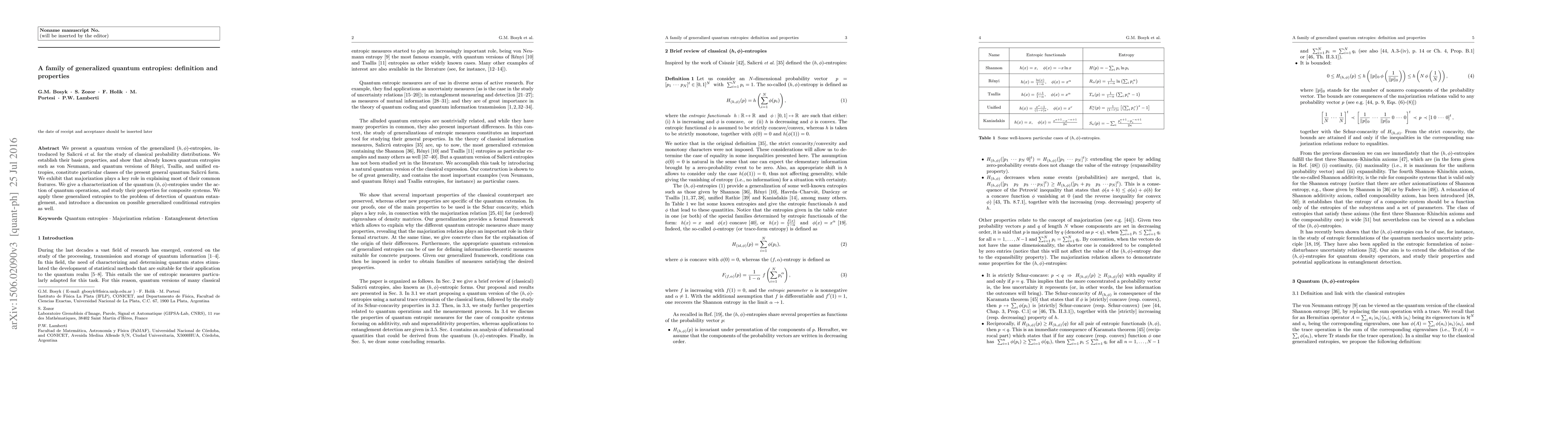 This paper introduces a family of generalized quantum entropies, extending classical $(h,\phi)$-entropies to quantum systems, and demonstrates their properties and connections to known quantum entropies. It also explores their role in quantum entanglement detection and discusses potential generalized conditional entropies.