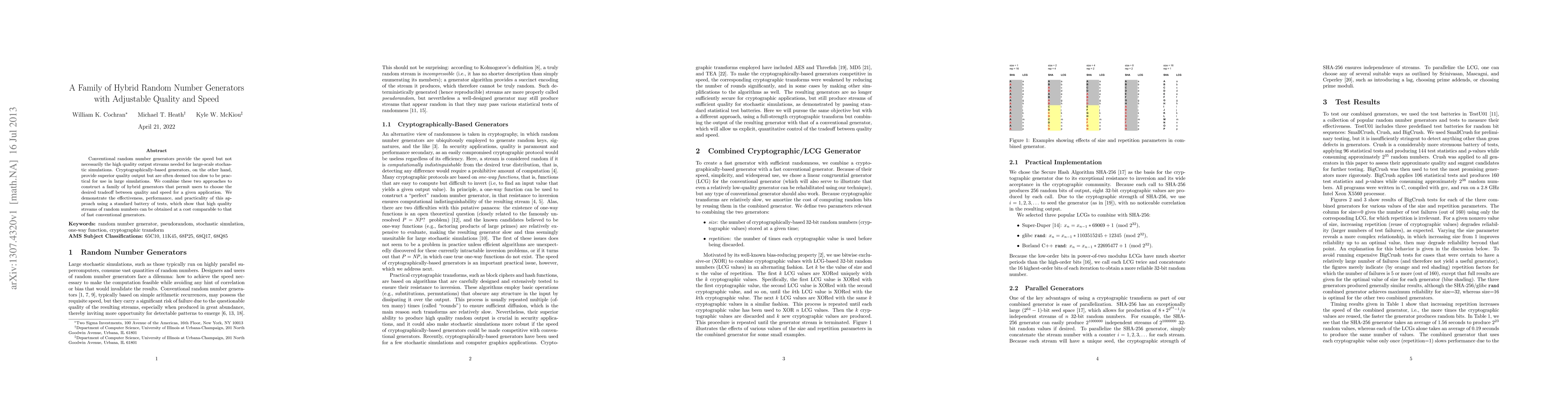 Conventional random number generators provide the speed but not necessarily the high quality output streams needed for large-scale stochastic simulations. Cryptographically-based generators, on the other hand, provide superior quality output but are often deemed too slow to be practical for use in large simulations. We combine these two approaches to construct a family of hybrid generators that permit users to choose the desired tradeoff between quality and speed for a given application. We demonstrate the effectiveness, performance, and practicality of this approach using a standard battery of tests, which show that high quality streams of random numbers can be obtained at a cost comparable to that of fast conventional generators.