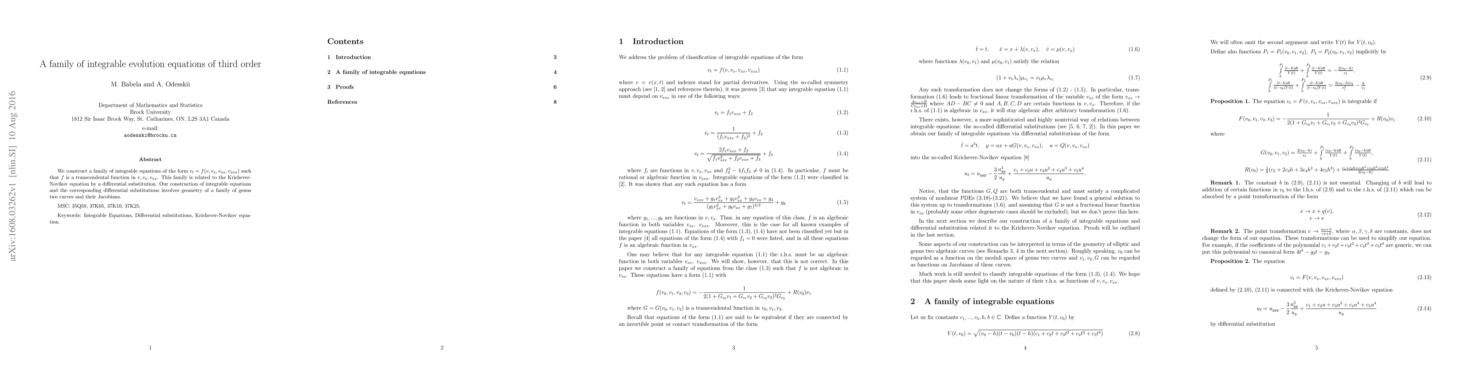 This paper constructs a family of third-order integrable evolution equations using transcendental functions and relates them to the Krichever-Novikov equation via differential substitutions, grounded in the geometry of genus two curves and their Jacobians.