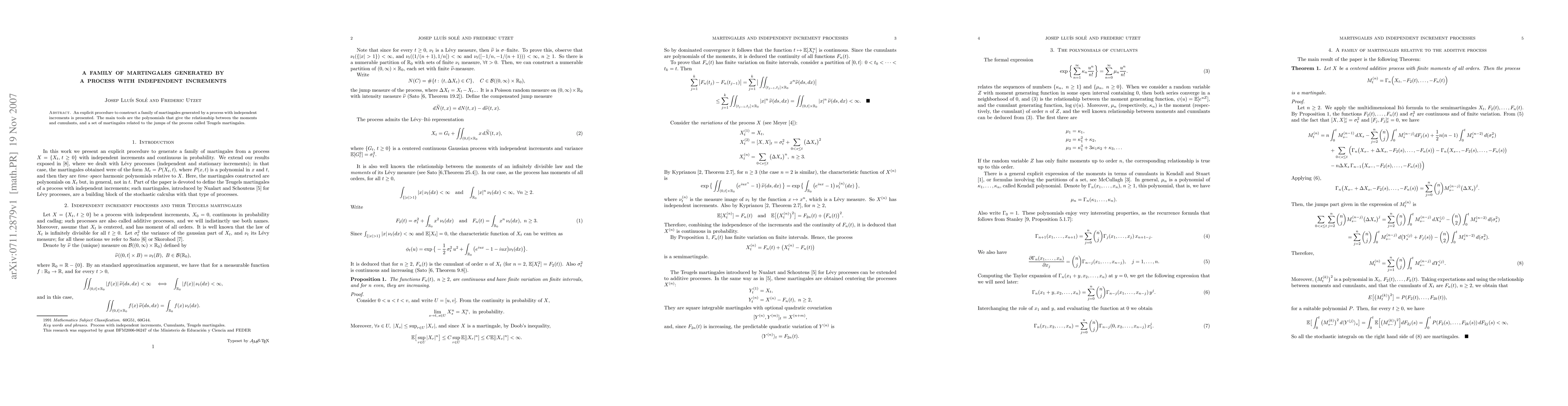 An explicit procedure to construct a family of martingales generated by a process with independent increments is presented. The main tools are the polynomials that give the relationship between the moments and cumulants, and a set of martingales related to the jumps of the process called Teugels martingales