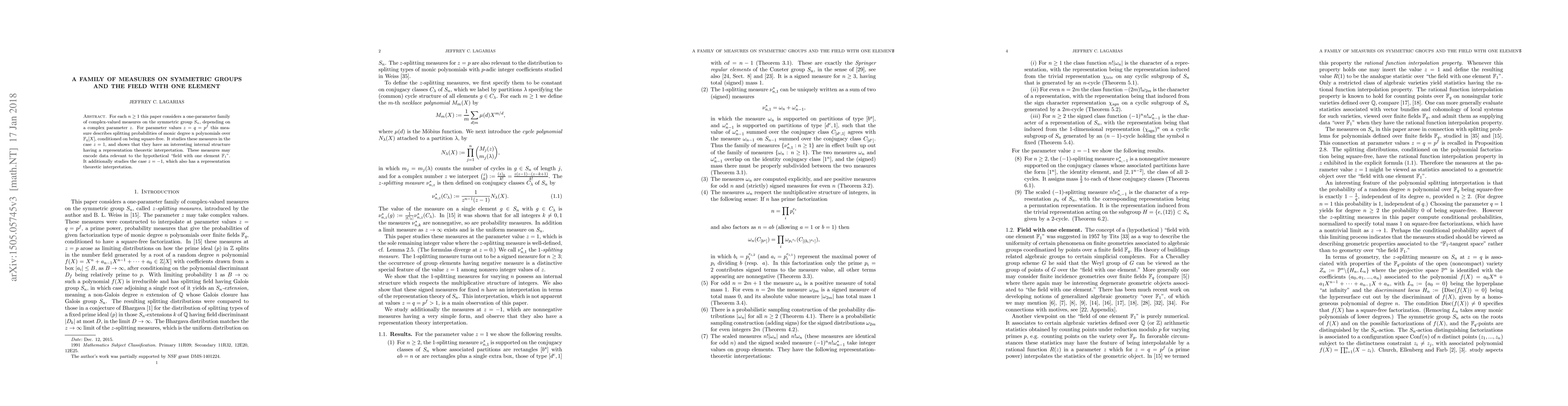 For each positive integer n this paper considers a one-parameter family of complex-valued measures on the symmetric group S_n, depending on a complex parameter z. For parameter values z=p^f a prime power, this measure describes splitting probabilities for monic degree n polynomials over the finite field with p^f elements, conditioned on being square-free. It studies these measure in the special case z=1, and shows they have an interesting internal structure having a representation theoretic interpretation. These measures may provide data relevant to the hypothetical "field with one element ${\mathbb F_1}$". It additionally studies the case z=-1, which also has a representation-theoretic interpretation