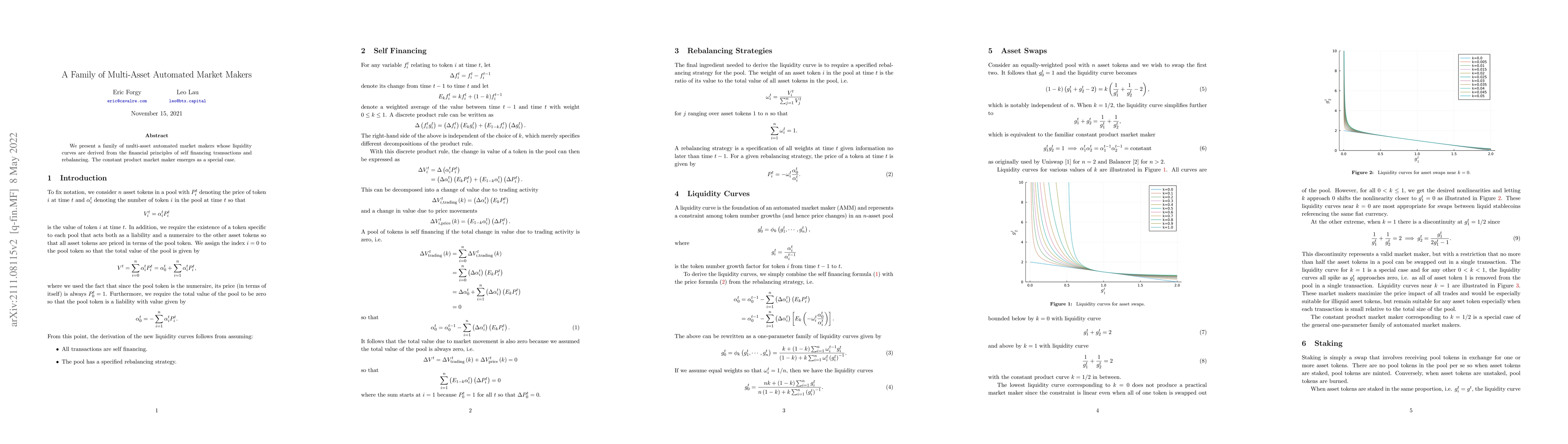 Summary: This paper introduces a suite of multi-asset automated market makers utilizing self-financing and rebalancing principles, with the constant product market maker as a notable example. The approach aims to optimize liquidity provision across various financial instruments.