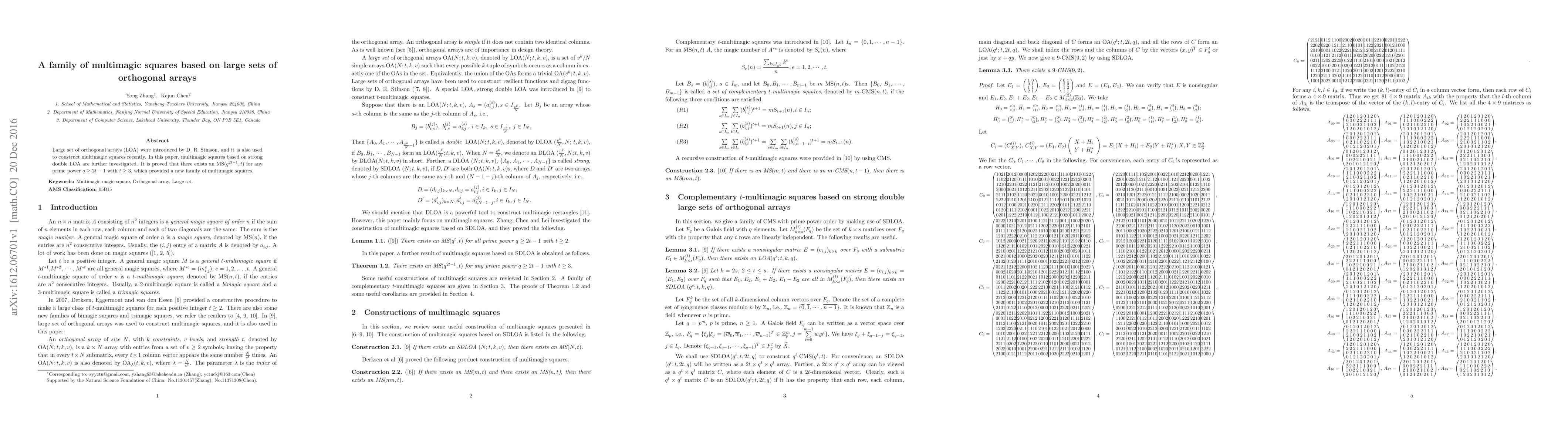 This paper explores multimagic squares constructed from strong double large sets of orthogonal arrays (LOA). It proves the existence of an MS$(q^{2t-1},t)$ for any prime power $q\geq 2t-1$ with $t\geq3$, introducing a new family of multimagic squares.