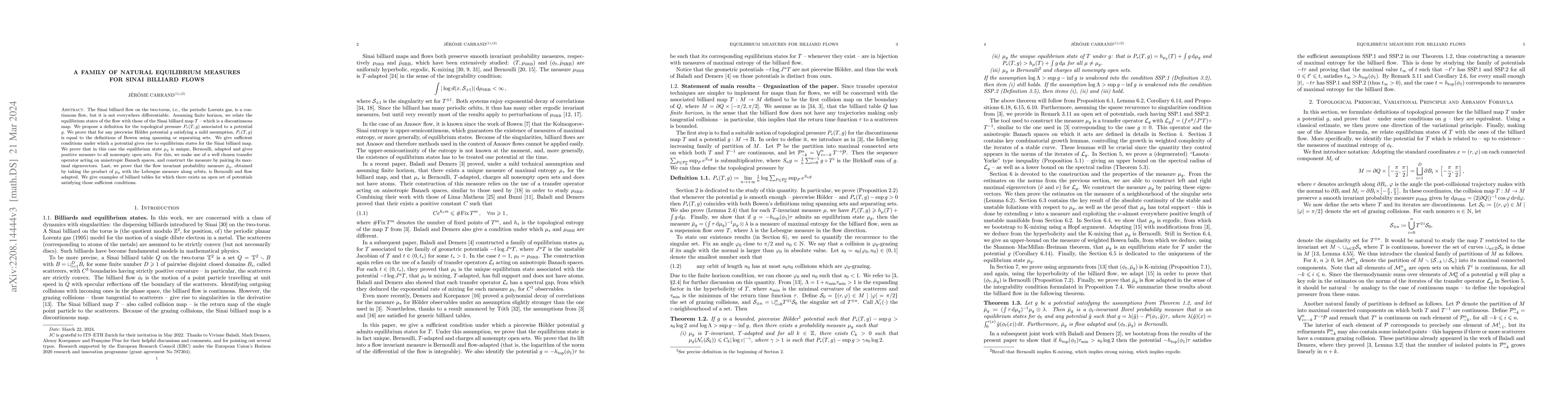 The Sinai billiard flow on the two-torus, i.e., the periodic Lorentz gas, is a continuous flow, but it is not everywhere differentiable. Assuming finite horizon, we relate the equilibrium states of the flow with those of the Sinai billiard map $T$ -- which is a discontinuous map. We propose a definition for the topological pressure $P_*(T,g)$ associated to a potential $g$. We prove that for any piecewise H\"older potential $g$ satisfying a mild assumption, $P_*(T,g)$ is equal to the definitions of Bowen using spanning or separating sets. We give sufficient conditions under which a potential gives rise to equilibrium states for the Sinai billiard map. We prove that in this case the equilibrium state $\mu_g$ is unique, Bernoulli, adapted and gives positive measure to all nonempty open sets. For this, we make use of a well chosen transfer operator acting on anisotropic Banach spaces, and construct the measure by pairing its maximal eigenvectors. Last, we prove that the flow invariant probability measure $\bar \mu_g$, obtained by taking the product of $\mu_g$ with the Lebesgue measure along orbits, is Bernoulli and flow adapted. We give examples of billiard tables for which there exists an open set of potentials satisfying those sufficient conditions.