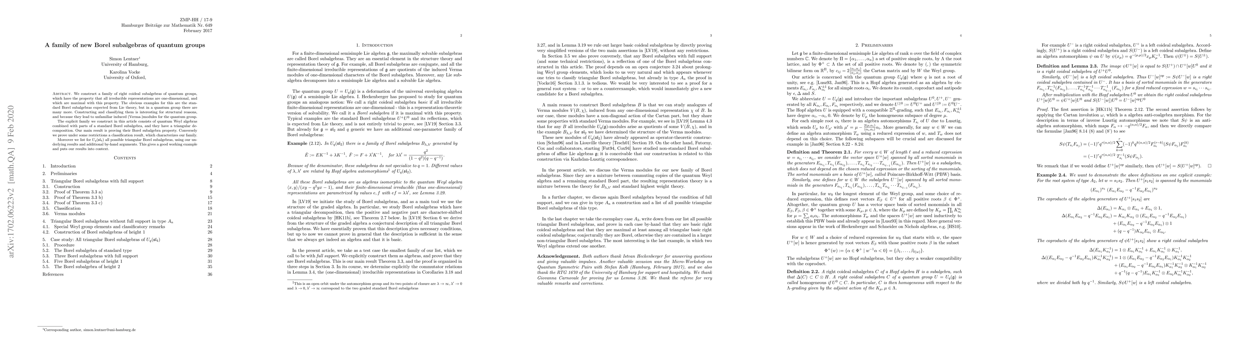 We construct a family of right coideal subalgebras of quantum groups, which have the property that all irreducible representations are one-dimensional, and which are maximal with this property. The obvious examples for this are the standard Borel subalgebras expected from Lie theory, but in a quantum group there are many more. Constructing and classifying them is interesting for structural reasons, and because they lead to unfamiliar induced (Verma-)modules for the quantum group. The explicit family we construct in this article consists of quantum Weyl algebras combined with parts of a standard Borel subalgebra, and they have a triangular decomposition. Our main result is proving their Borel subalgebra property. Conversely we prove under some restrictions a classification result, which characterizes our family. Moreover we list for Uq(sl4) all possible triangular Borel subalgebras, using our underlying results and additional by-hand arguments. This gives a good working example and puts our results into context.