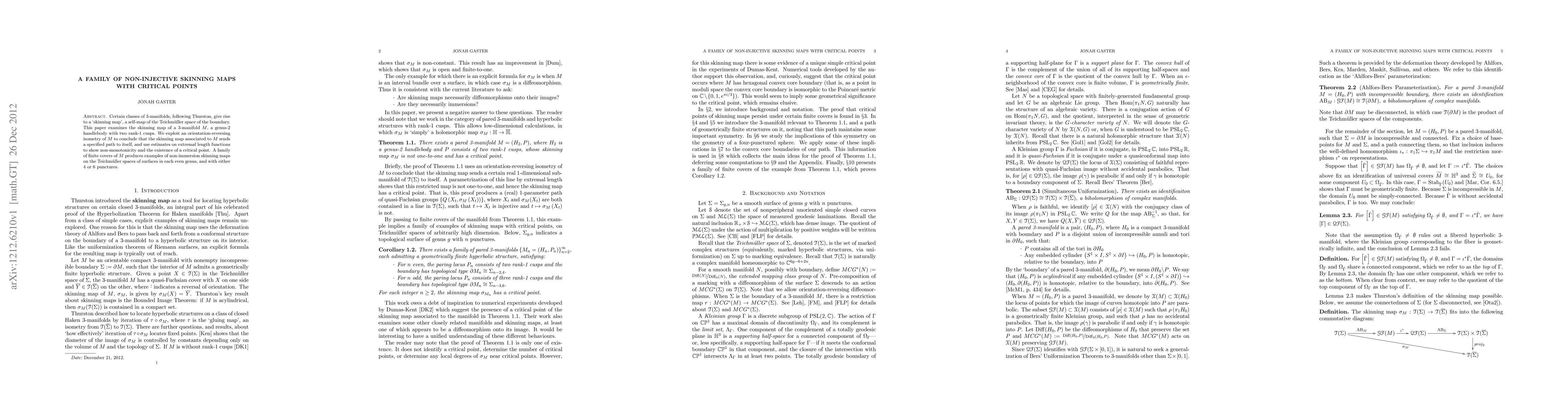 Certain classes of 3-manifolds, following Thurston, give rise to a 'skinning map', a self-map of the Teichm\"{u}ller space of the boundary. This paper examines the skinning map of a 3-manifold M, a genus-2 handlebody with two rank-1 cusps. We exploit an orientation-reversing isometry of M to conclude that the skinning map associated to M sends a specified path to itself, and use estimates on extremal length functions to show non-monotonicity and the existence of a critical point. A family of finite covers of M produces examples of non-immersion skinning maps on the Teichm\"{u}ller spaces of surfaces in each even genus, and with either 4 or 6 punctures.
