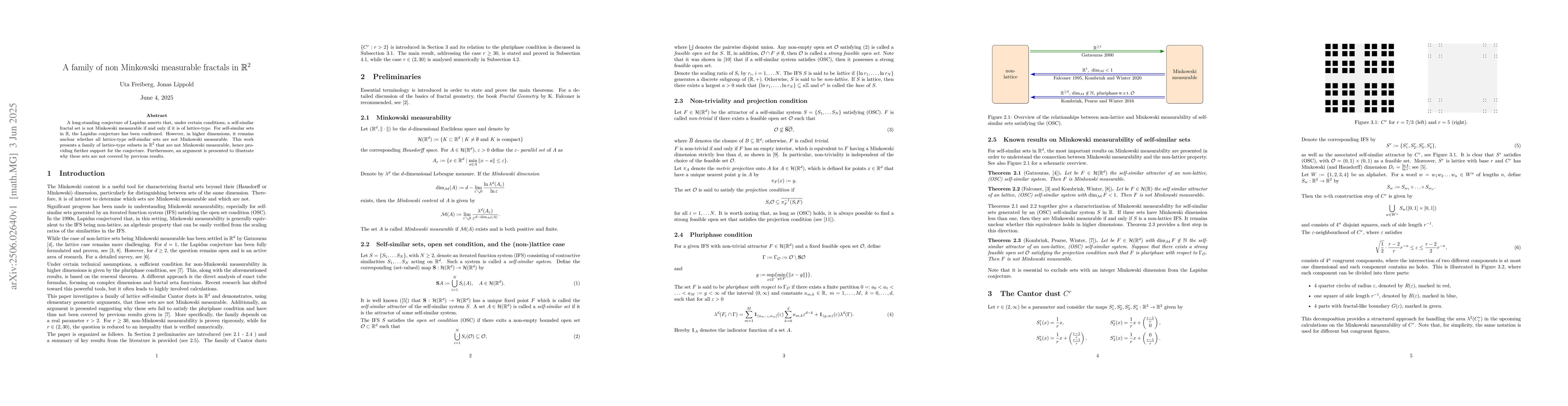 A family of lattice-type fractals in $ ext{R}^2$ are shown to not be Minkowski measurable, supporting the Lapidus conjecture and expanding knowledge on self-similar sets in higher dimensions.