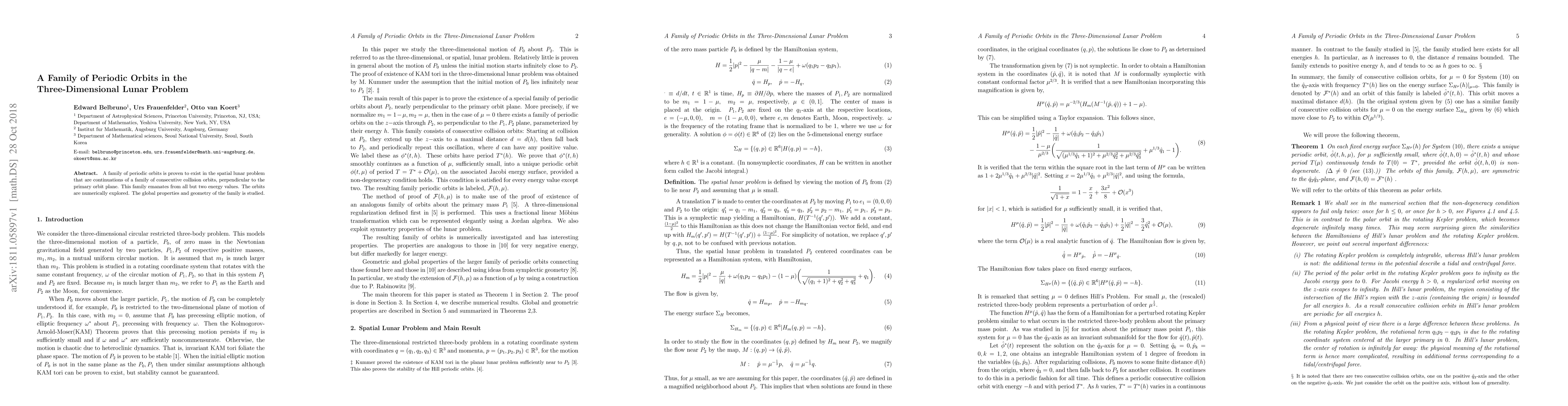 A family of periodic orbits is proven to exist in the spatial lunar problem that are continuations of a family of consecutive collision orbits, perpendicular to the primary orbit plane. This family emanates from all but two energy values. The orbits are numerically explored. The global properties and geometry of the family is studied.