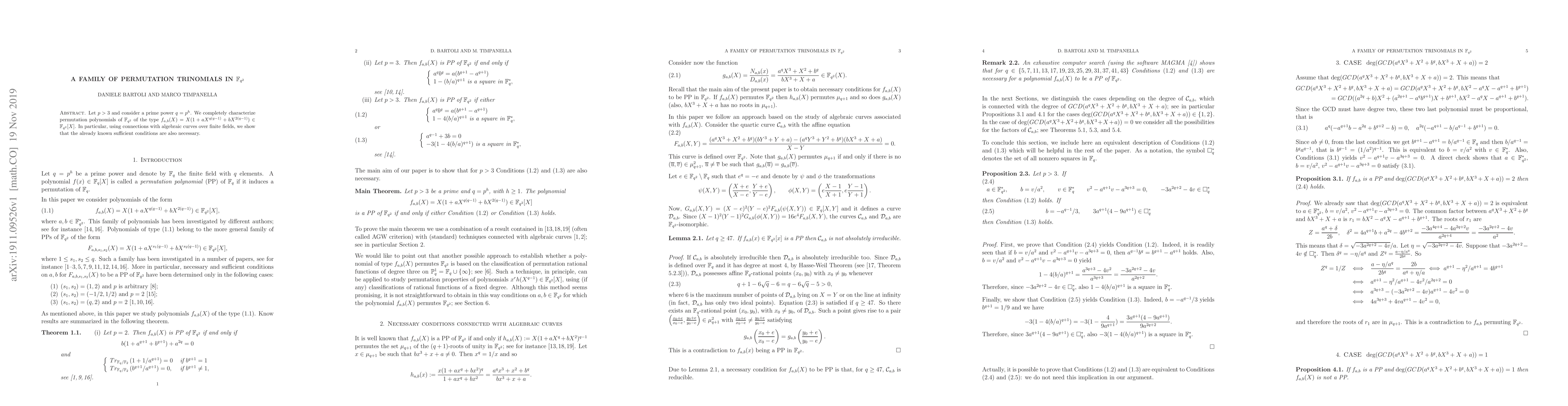 This paper characterizes permutation trinomials of the form $f_{a,b}(X)$ in $\mathbb{F}_{q^2}$, proving that previously known sufficient conditions for permutation are also necessary, leveraging connections with algebraic curves over finite fields.