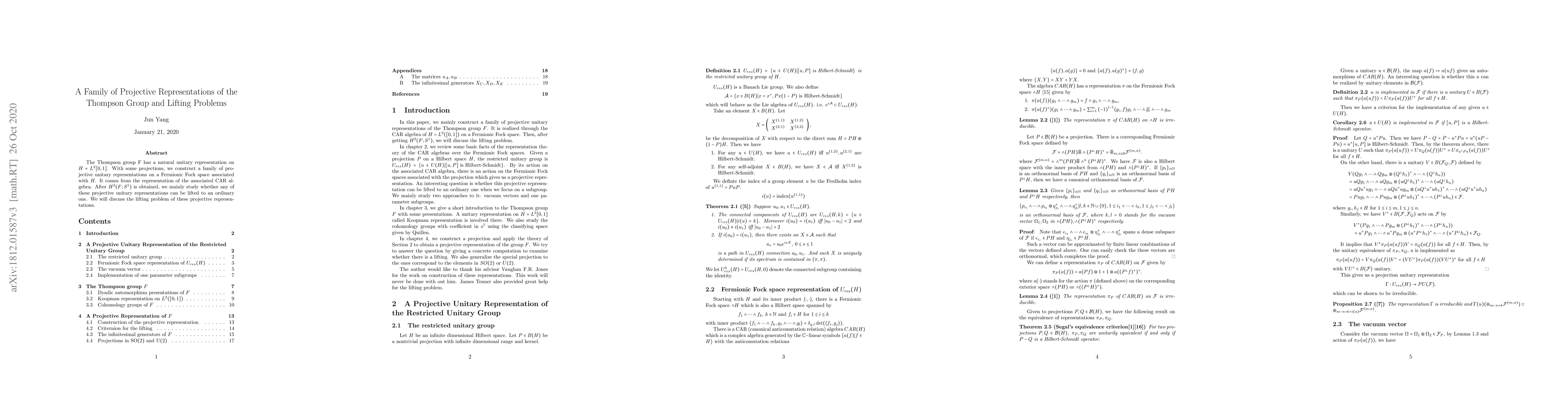 The Thompson group F has a natural unitary representation on $H=L^2[0,1]$. With some projections, we construct a family of projective unitary representations on a Fermionic Fock space associated with $H$. It comes from the representation of the associated CAR algebra. After $H^2(F;S^1)$ is obtained, we mainly study whether any of these projective unitary representations can be lifted to an ordinary one. We will discuss the lifting problem of these projective representations.