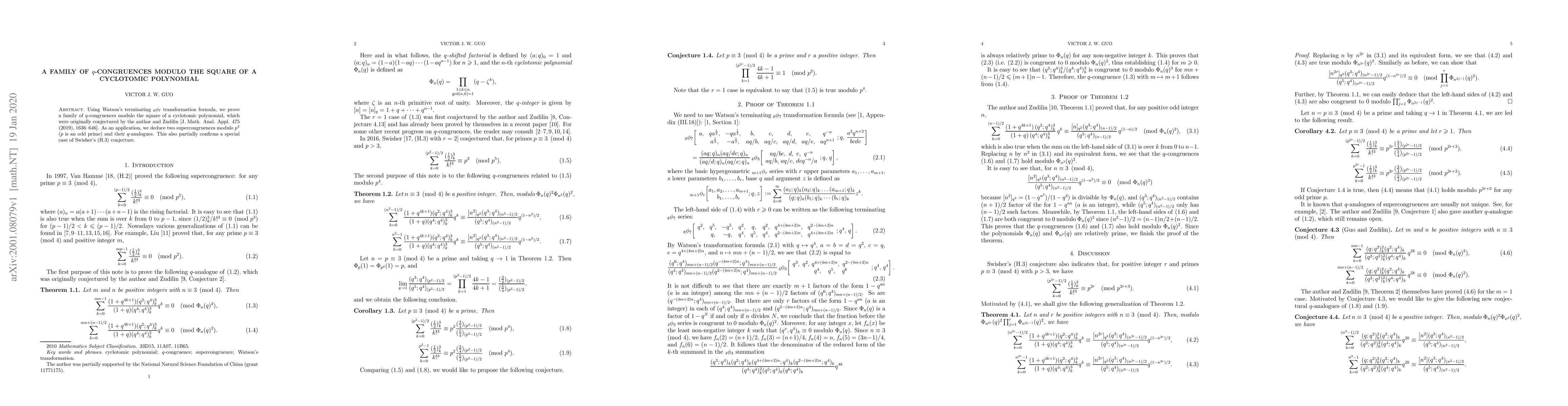 The paper proves a family of $q$-congruences modulo the square of a cyclotomic polynomial using Watson's $_8\phi_7$ transformation, confirming earlier conjectures by the author and Zudilin. As an application, it derives two supercongruences modulo $p^4$ for odd primes $p$ and their $q$-analogues, partially supporting a special case of Swisher's conjecture.