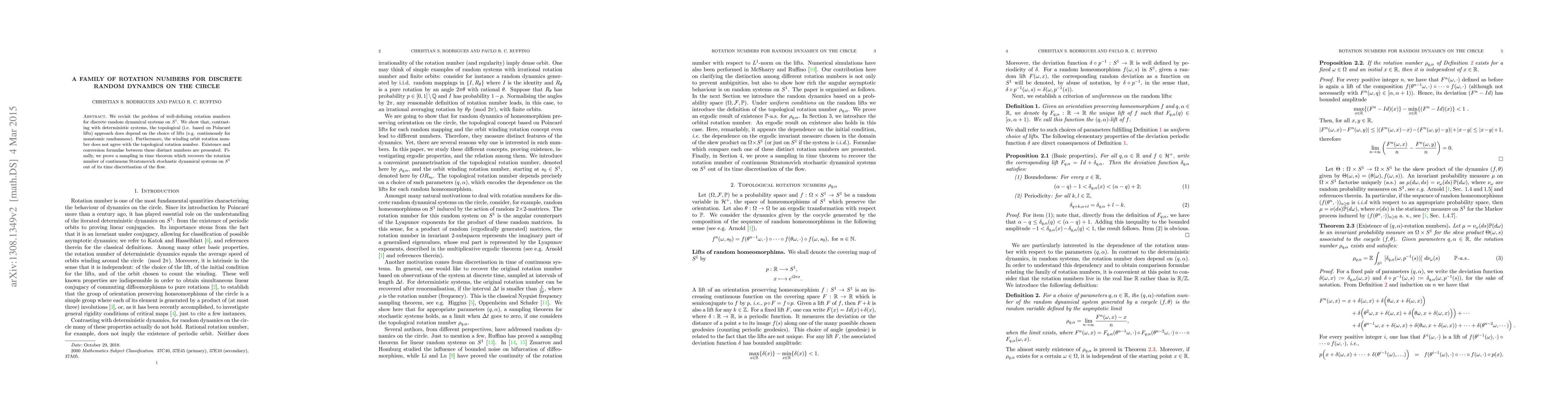 We revisit the problem of well-defining rotation numbers for discrete random dynamical systems on the circle. We show that, contrasting with deterministic systems, the topological (i.e. based on Poincar\'{e} lifts) approach does depend on the choice of lifts (e.g. continuously for nonatomic randomness). Furthermore, the winding orbit rotation number does not agree with the topological rotation number. Existence and conversion formulae between these distinct numbers are presented. Finally, we prove a sampling in time theorem which recover the rotation number of continuous Stratonovich stochastic dynamical systems on $S^1$ out of its time discretisation of the flow.