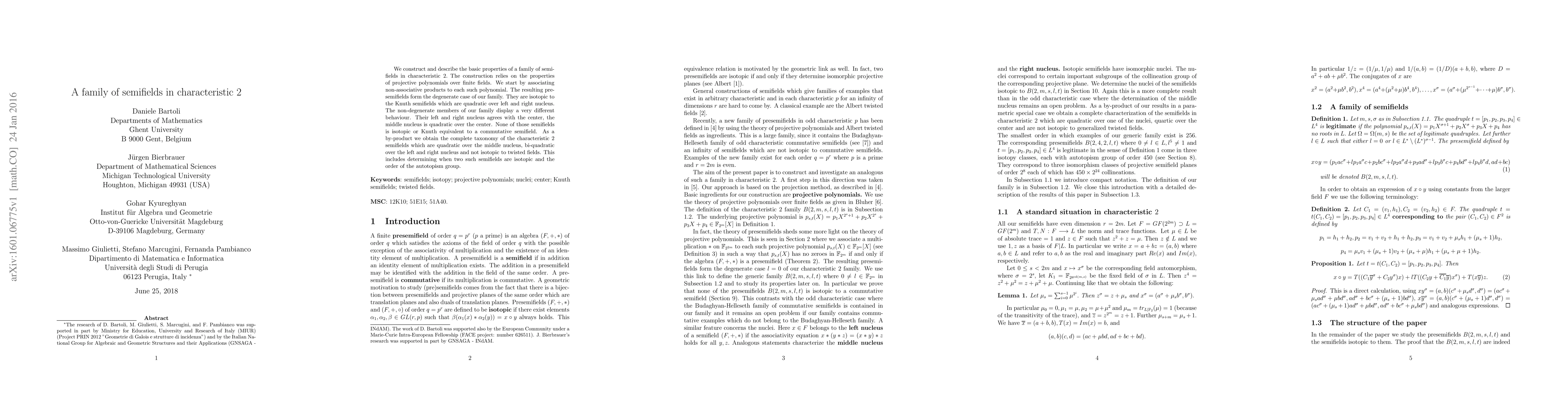 The paper introduces a novel family of semifields in characteristic 2, characterized by specific algebraic properties derived from projective polynomials over finite fields.