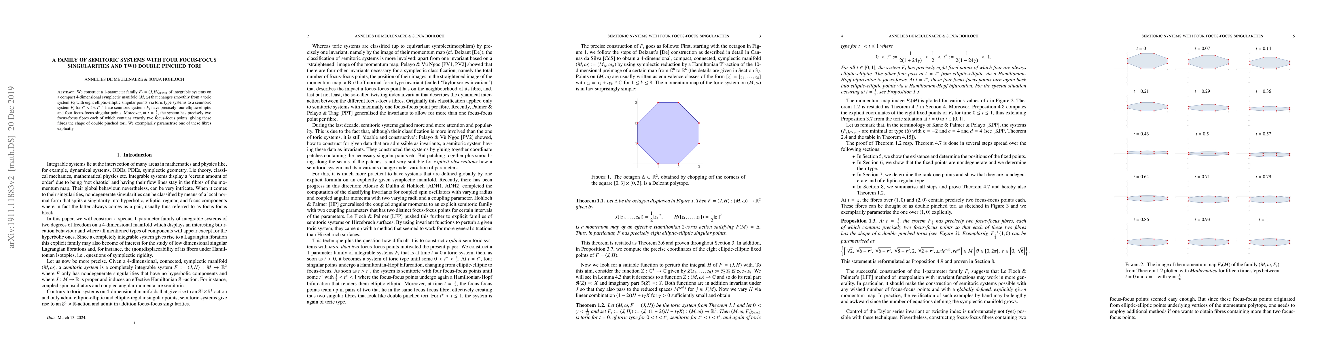 We construct a 1-parameter family $F_t=(J, H_t)_{0 \leq t \leq 1}$ of integrable systems on a compact $4$-dimensional symplectic manifold $(M, \omega)$ that changes smoothly from a toric system $F_0$ with eight elliptic-elliptic singular points via toric type systems to a semitoric system $F_t$ for $ t^- < t < t^+$. These semitoric systems $F_t$ have precisely four elliptic-elliptic and four focus-focus singular points. Moreover, at $t= \frac{1}{2}$, the system has precisely two focus-focus fibres each of which contains exactly two focus-focus points, giving these fibres the shape of double pinched tori. We exemplarily parametrise one of these fibres explicitly.