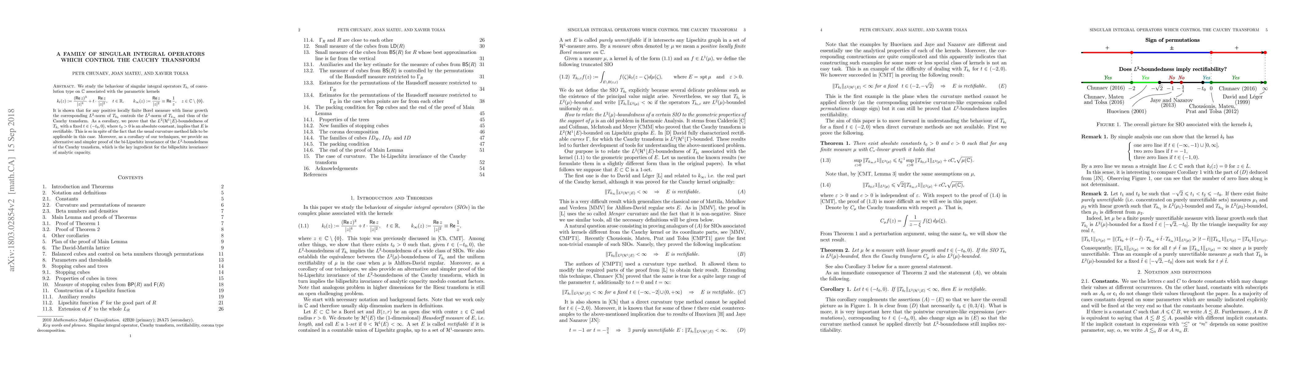 We study the behaviour of singular integral operators $T_{k_t}$ of convolution type on $\mathbb{C}$ associated with the parametric kernels $$ k_t(z):=\frac{(\Re z)^{3}}{|z|^{4}}+t\cdot \frac{\Re z}{|z|^{2}}, \quad t\in \mathbb{R},\qquad k_\infty(z):=\frac{\Re z}{|z|^{2}}\equiv \Re \frac{1}{z},\quad z\in \mathbb{C}\setminus\{0\}. $$ It is shown that for any positive locally finite Borel measure with linear growth the corresponding $L^2$-norm of $T_{k_0}$ controls the $L^2$-norm of $T_{k_\infty}$ and thus of the Cauchy transform. As a corollary, we prove that the $L^2(\mathcal{H}^1\lfloor E)$-boundedness of $T_{k_t}$ with a fixed $t\in (-t_0,0)$, where $t_0>0$ is an absolute constant, implies that $E$ is rectifiable. This is so in spite of the fact that the usual curvature method fails to be applicable in this case. Moreover, as a corollary of our techniques, we provide an alternative and simpler proof of the bi-Lipschitz invariance of the $L^2$-boundedness of the Cauchy transform, which is the key ingredient for the bi-Lipschitz invariance of analytic capacity.