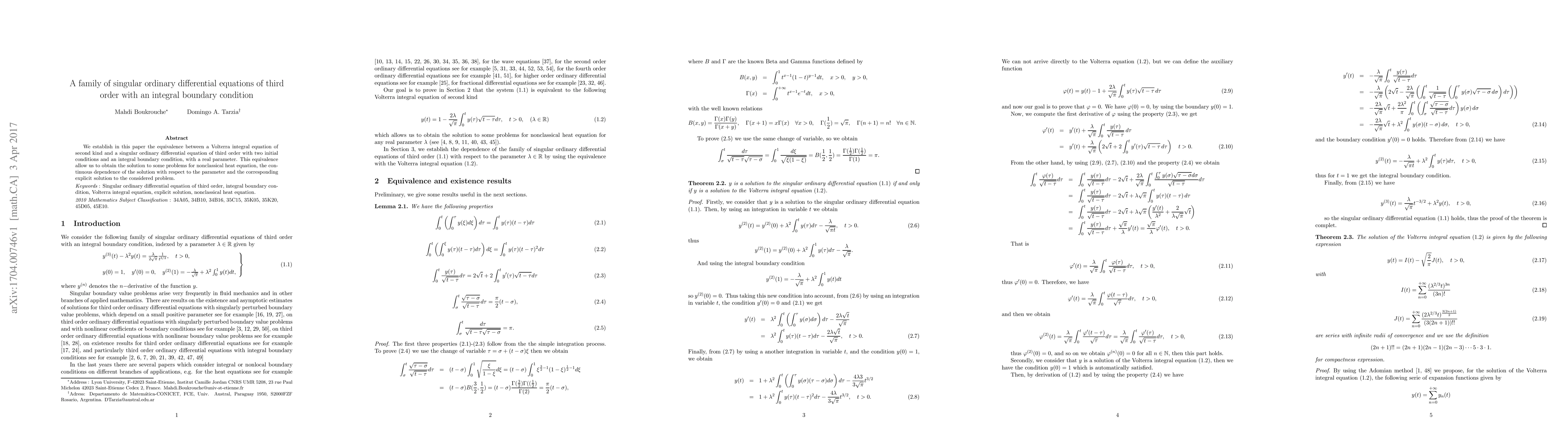 This paper demonstrates the equivalence between a Volterra integral equation of the second kind and a third-order singular ordinary differential equation with an integral boundary condition, enabling solutions to nonclassical heat equations and establishing continuous dependence on parameters.