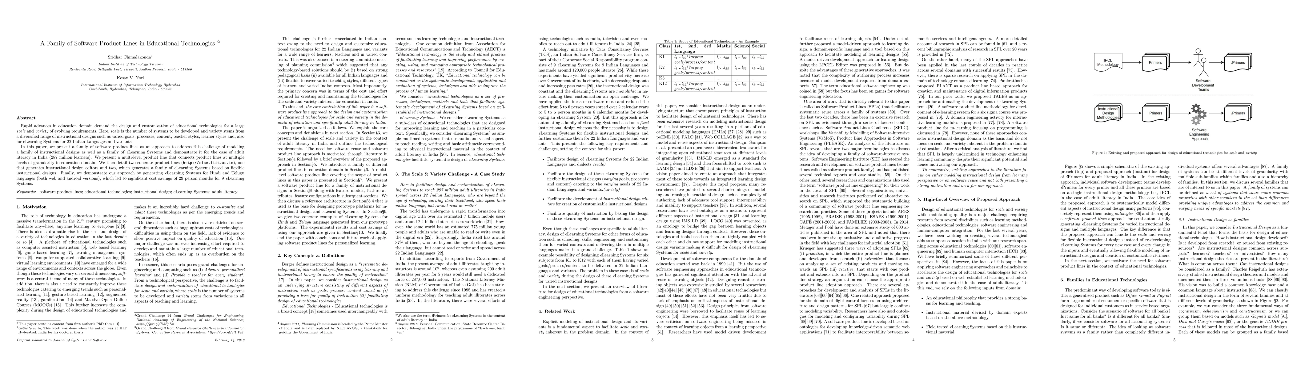 This paper proposes a software product line approach to develop scalable and customizable educational technologies for diverse instructional designs and 22 Indian languages. It demonstrates the approach through generating eLearning systems for adult literacy in India, achieving notable cost savings.