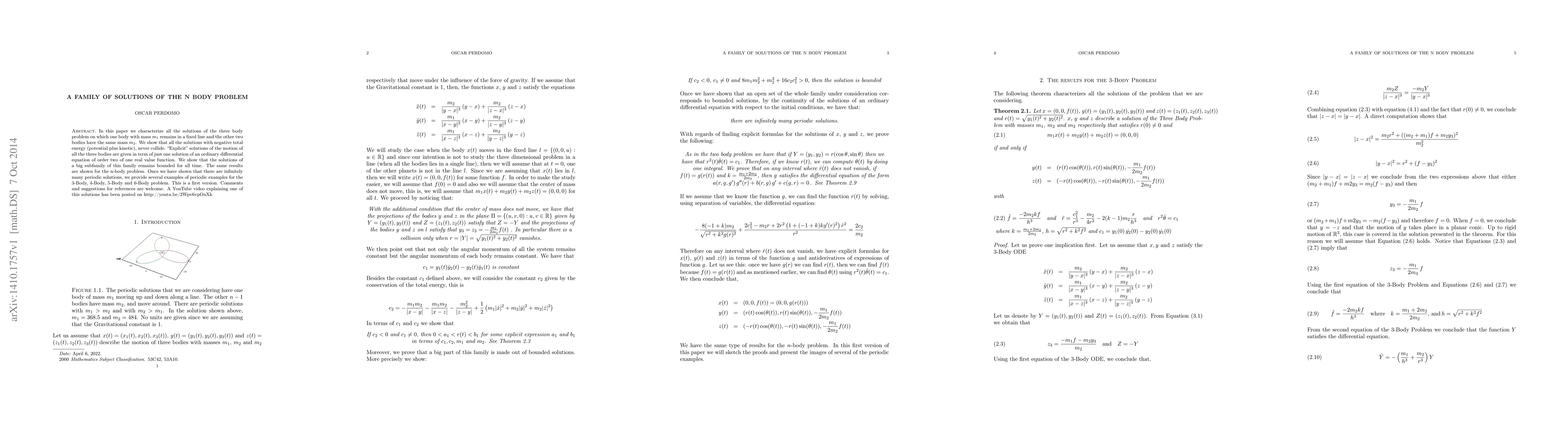 In this paper we characterize all the solutions of the three body problem on which one body with mass $m_1$ remains in a fixed line and the other two bodies have the same mass $m_2$. We show that all the solutions with negative total energy (potential plus kinetic), never collide. "Explicit" solutions of the motion of all the three bodies are given in term of just one solution of an ordinary differential equation of order two of one real value function. We show that the solutions of a big subfamily of this family remains bounded for all time. The same results are shown for the n-body problem. When the body on the line remains constant, we have provide exact formulas for the solutions --for any n-- in the same way as we have for the two body problem. Once we have shown that there are infinitely many periodic solutions, we provide several examples of periodic examples for the 3-Body, 4-Body, 5-Body and 6-Body problem. This is a first version. Comments and suggestions for references are welcome. A YouTube video explaining one of this solutions has been posted on http://youtu.be/2Wpv6vpOxXk