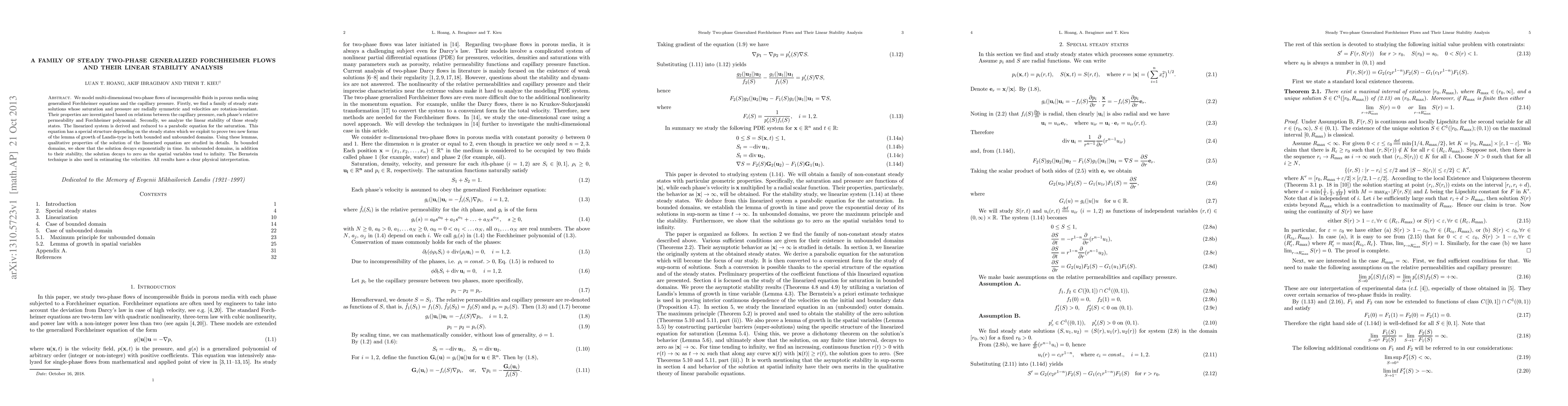 We model multi-dimensional two-phase flows of incompressible fluids in porous media using generalized Forchheimer equations and the capillary pressure. Firstly, we find a family of steady state solutions whose saturation and pressure are radially symmetric and velocities are rotation-invariant. Their properties are investigated based on relations between the capillary pressure, each phase's relative permeability and Forchheimer polynomial. Secondly, we analyze the linear stability of those steady states. The linearized system is derived and reduced to a parabolic equation for the saturation. This equation has a special structure depending on the steady states which we exploit to prove two new forms of the lemma of growth of Landis-type in both bounded and unbounded domains. Using these lemmas, qualitative properties of the solution of the linearized equation are studied in details. In bounded domains, we show that the solution decays exponentially in time. In unbounded domains, in addition to their stability, the solution decays to zero as the spatial variables tend to infinity. The Bernstein