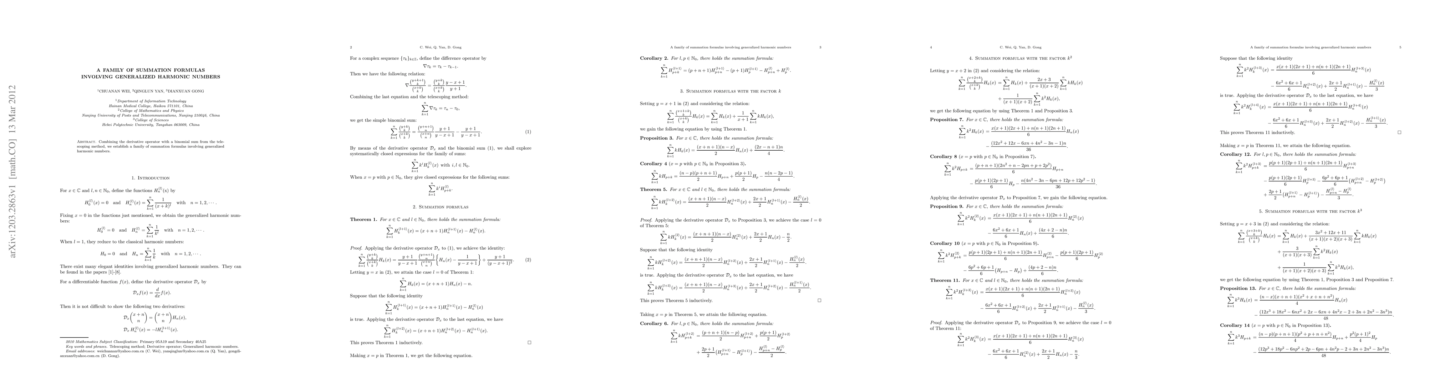 Summary: The paper presents a set of summation formulas using derivatives and binomial sums, focusing on generalized harmonic numbers, derived through the telescoping method. These formulas extend the understanding of harmonic number properties.