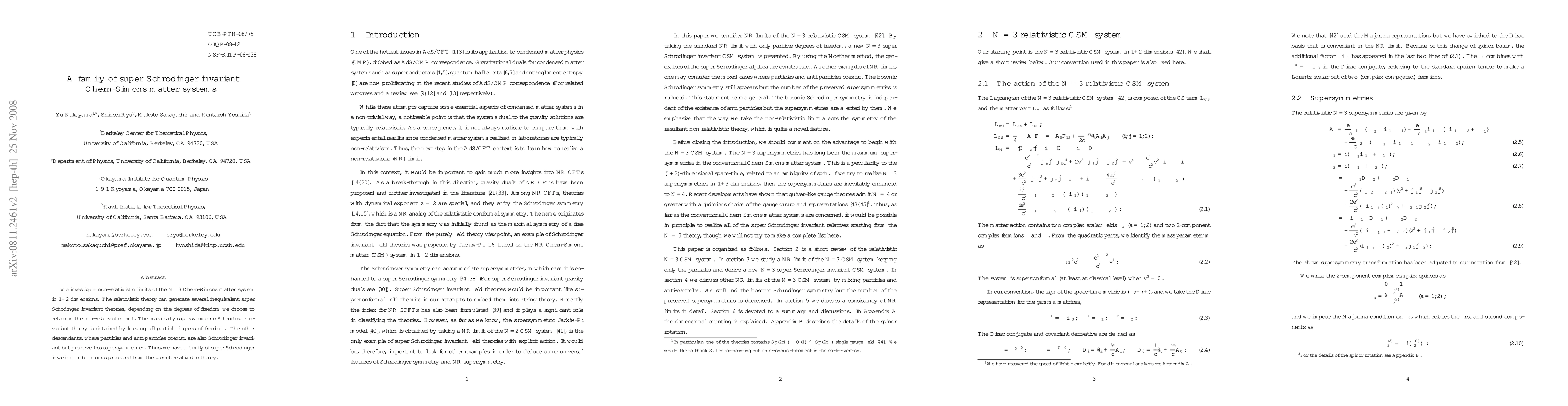 We investigate non-relativistic limits of the N=3 Chern-Simons matter system in 1+2 dimensions. The relativistic theory can generate several inequivalent super Schodinger invariant theories, depending on the degrees of freedom we choose to retain in the non-relativistic limit. The maximally supersymmetric Schrodinger invariant theory is obtained by keeping all particle degrees of freedom. The other descendants, where particles and anti-particles coexist, are also Schrodinger invariant but preserve less supersymmetries. Thus, we have a family of super Schrodinger invariant field theories produced from the parent relativistic theory.