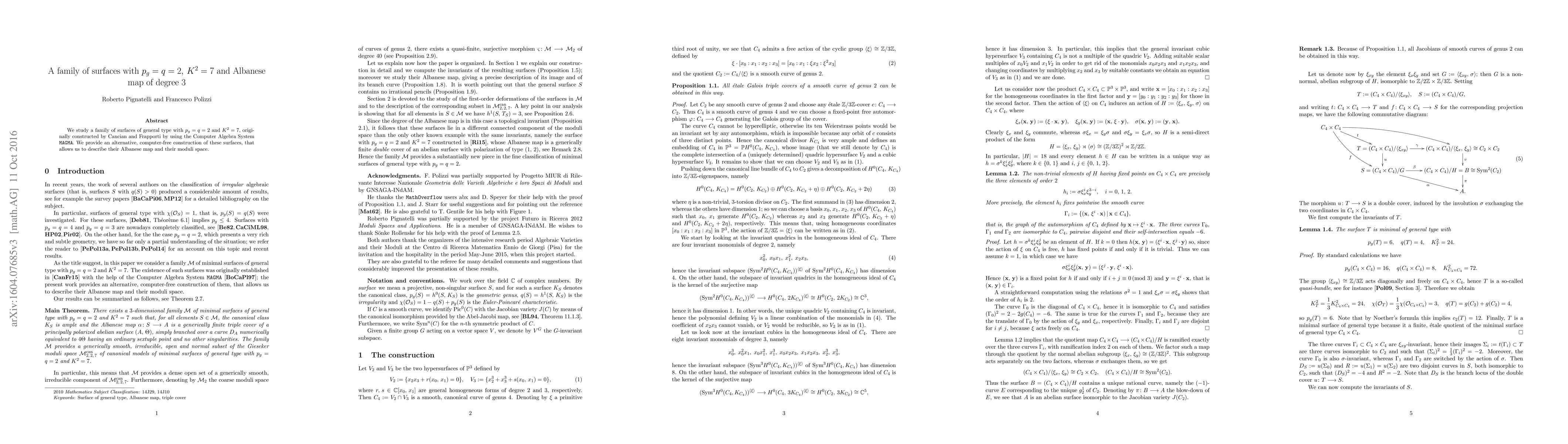 This paper presents an alternative, computer-free construction of a family of surfaces of general type with $p_g=q=2$ and $K^2=7$, originally constructed using MAGMA, and describes their Albanese map and moduli space.