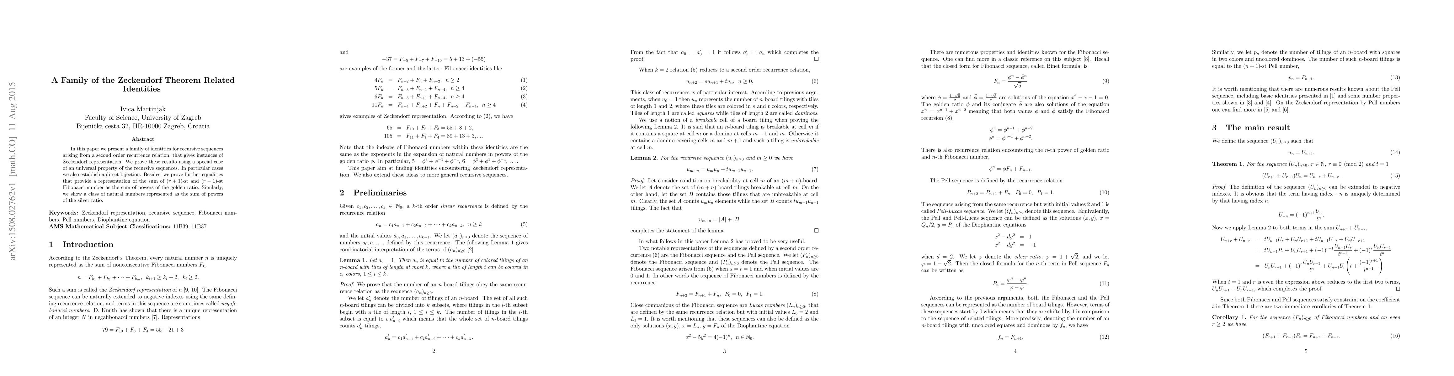 In this paper we present a family of identities for recursive sequences arising from a second order recurrence relation, that gives instances of Zeckendorf representation. We prove these results using a special case of an universal property of the recursive sequences. In particular cases we also establish a direct bijection. Besides, we prove further equalities that provide a representation of the sum of $(r+1)$-st and $(r-1)$-st Fibonacci number as the sum of powers of the golden ratio. Similarly, we show a class of natural numbers represented as the sum of powers of the silver ratio.