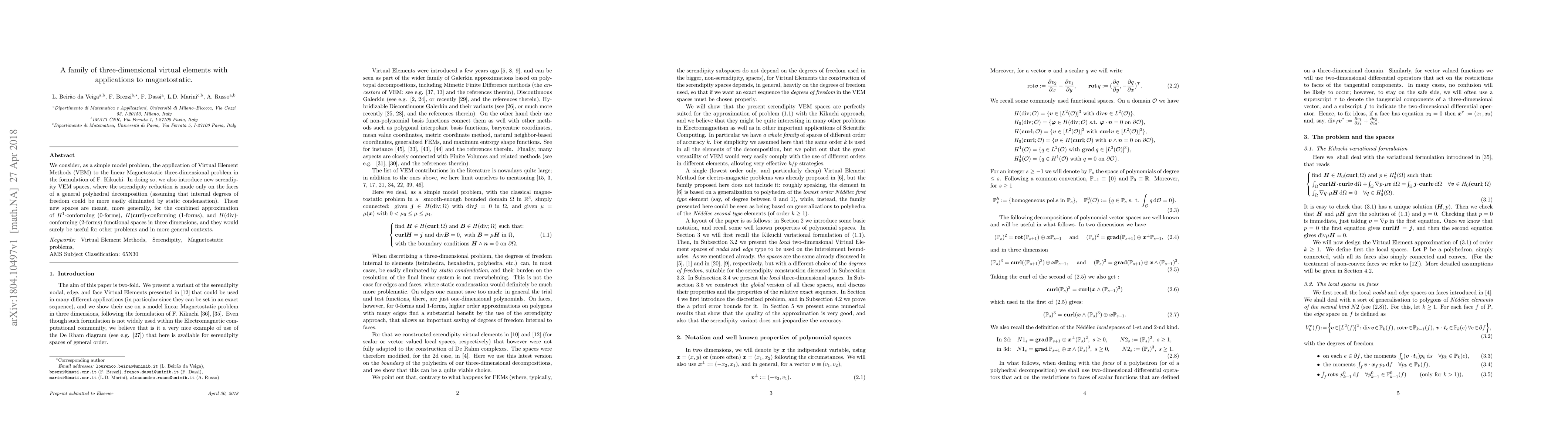 We consider, as a simple model problem, the application of Virtual Element Methods (VEM) to the linear Magnetostatic three-dimensional problem in the formulation of F. Kikuchi. In doing so, we also introduce new serendipity VEM spaces, where the serendipity reduction is made only on the faces of a general polyhedral decomposition (assuming that internal degrees of freedom could be more easily eliminated by static condensation). These new spaces are meant, more generally, for the combined approximation of $H^1$-conforming ($0$-forms), $H({\rm {\bf curl}})$-conforming ($1$-forms), and $H({\rm div})$-conforming ($2$-forms) functional spaces in three dimensions, and they would surely be useful for other problems and in more general contexts.