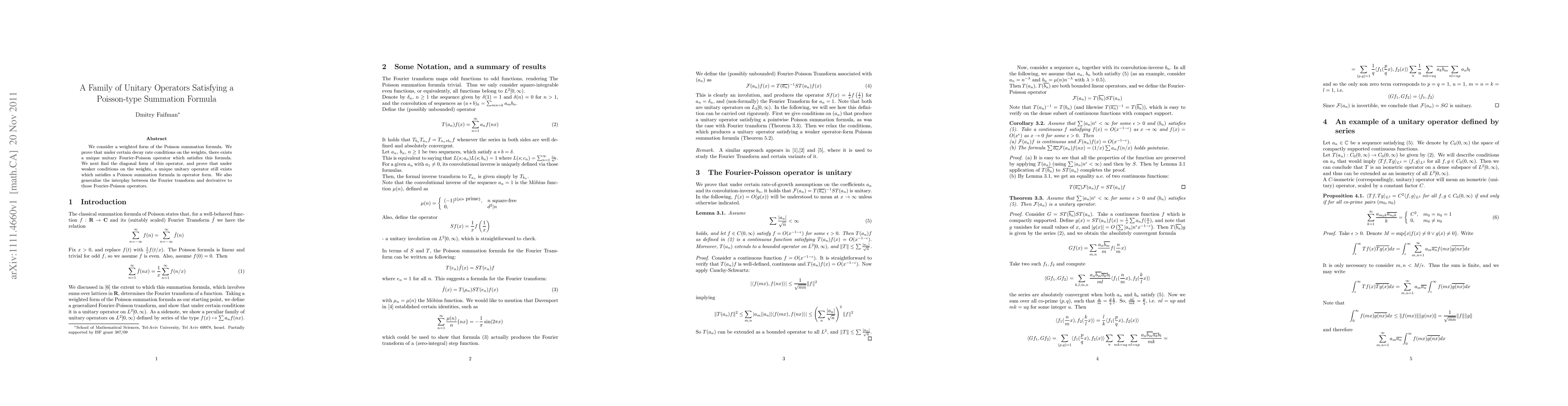 This paper explores a weighted Poisson summation formula and proves the existence of a unique unitary Fourier-Poisson operator under specific decay conditions. It also establishes the diagonal form of this operator and shows that a unique unitary operator still satisfies a Poisson summation formula under less stringent conditions.