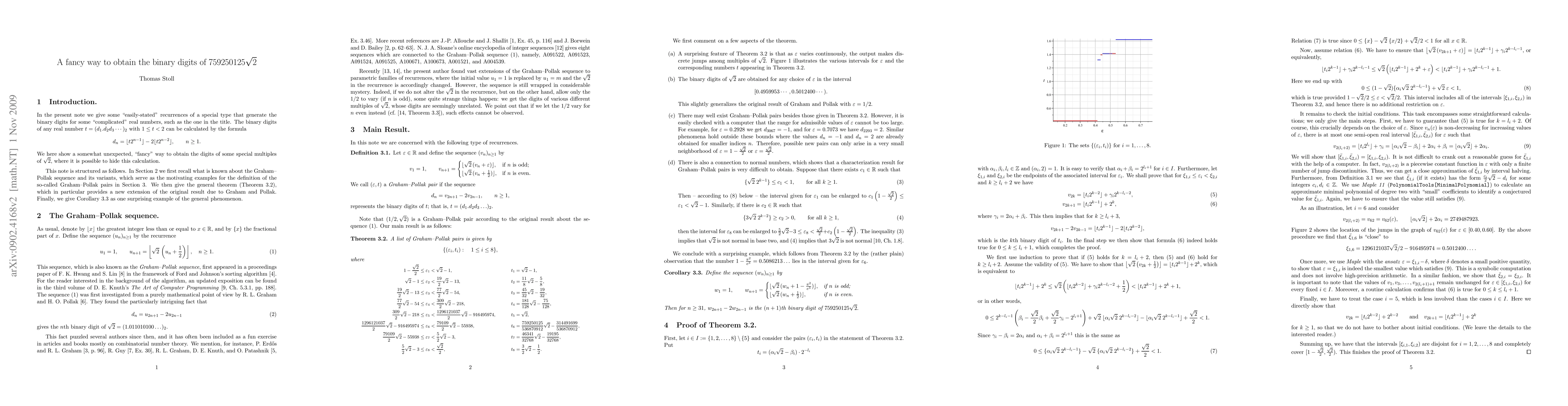 R. L. Graham and H. O. Pollak observed that the sequence $$u_1=1,\qquad u_{n+1}=\lfloor \sqrt{2} (u_n+1/2)\rfloor, \quad n\geq 1,$$ has the curious property that the sequence of numbers $(u_{2n+1}-2u_{2n-1})_{n\geq 1}$ denotes the binary digits of $\sqrt{2}$. We present an extension of Graham--Pollak's sequence which allows to get -- in a fancy way -- the binary digits of $759250125\sqrt{2}$ and other numbers.