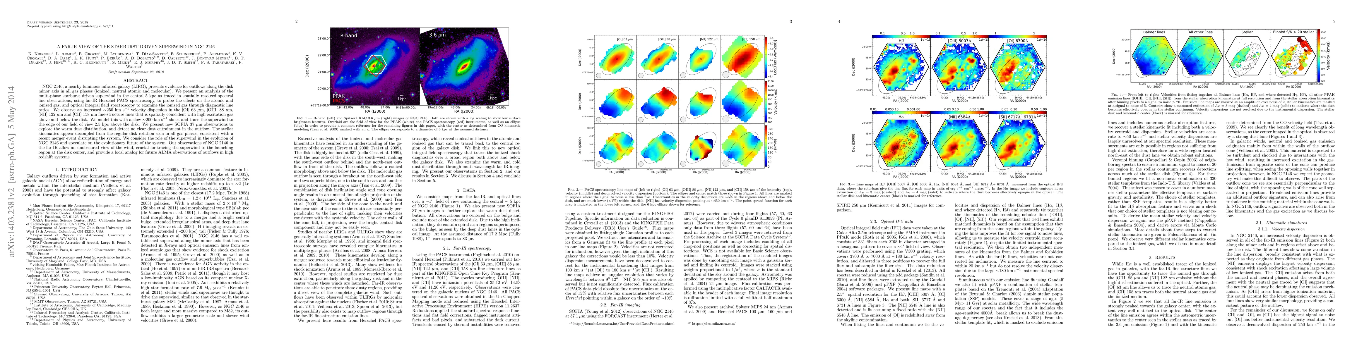 This study uses far-IR Herschel and SOFIA observations to analyze the multi-phase starburst-driven superwind in NGC 2146, revealing a ~250 km/s velocity dispersion in fine-structure lines and a decoupling of stellar kinematics from disk rotation, suggesting a recent merger. The superwind's impact on gas phases and dust distribution is examined, providing insights into the galaxy's evolution.