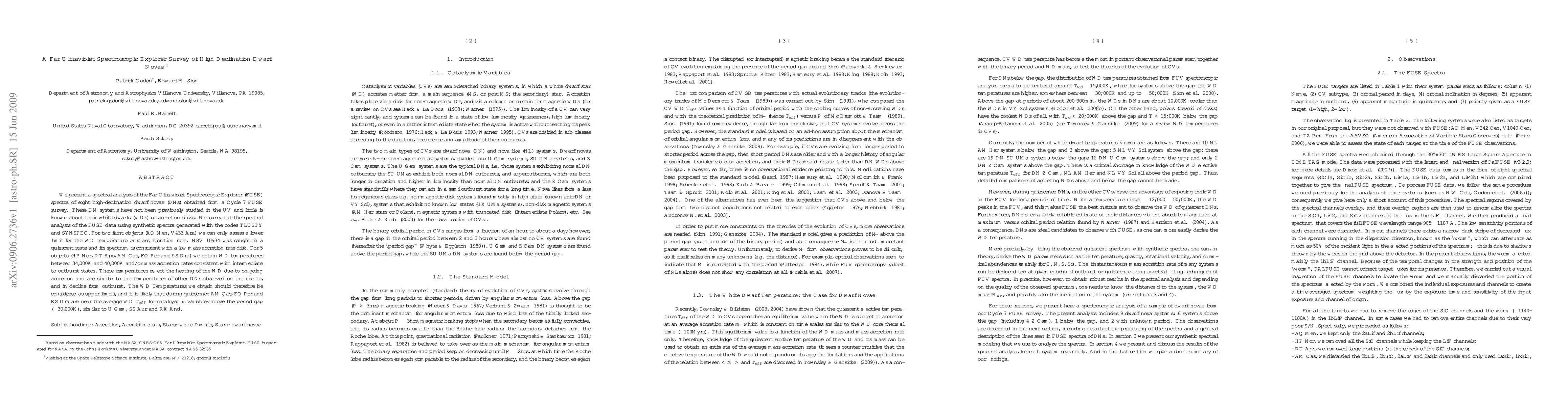 We present an analysis of the FUSE spectra of eight high-declination dwarf novae obtained from a Cycle 7 FUSE survey. These DN systems have not been previously studied in the UV and little is known about their white dwarfs (WDs) or accretion disks. We carry out the spectral analysis of the FUSE data using synthetic spectra generated with the codes TLUSTY and SYNSPEC. For two faint objects (AQ Men, V433 Ara) we can only assess a lower limit for the WD temperature or mass accretion rate. NSV 10934 was caught in a quiescent state and its spectrum is consistent with a low mass accretion rate disk. For 5 objects (HP Nor, DT Aps, AM Cas, FO Per and ES Dra) we obtain WD temperatures between 34,000K and 40,000K and/or mass accretion rates consistent with intermediate to outburst states. These temperatures reflect the heating of the WD due to on-going accretion and are similar to the temperatures of other DNs observed on the rise to, and in decline from outburst. The WD Temperatures we obtain should therefore be considered as upper limits, and it is likely that during quiescence AM Cas, FO Per and ES Dra are near the average WD Teff for catalcysmic variables above the period gap (30,000K), similar to U Gem, SS Aur and RX And.