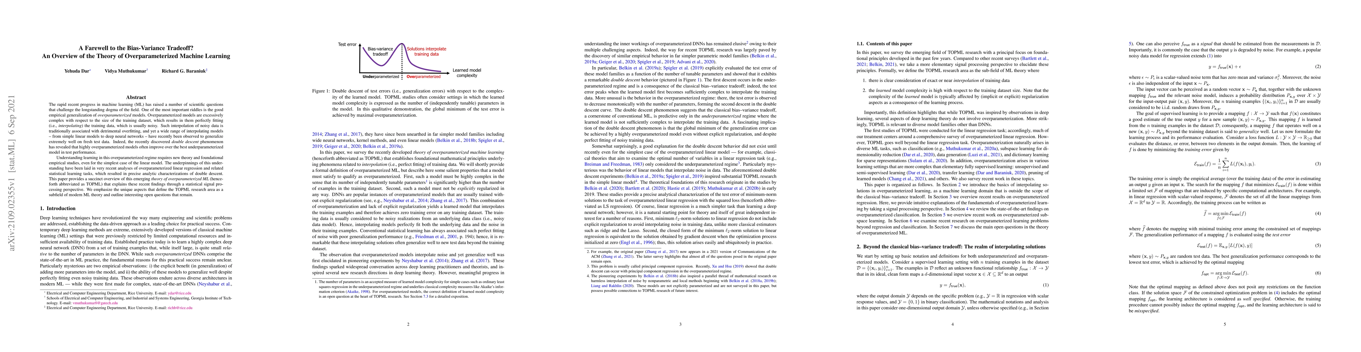 This paper explores the emerging theory of overparameterized machine learning (TOPML), which challenges the traditional bias-variance tradeoff by demonstrating that highly overparameterized models can generalize well despite fitting training data perfectly. It highlights the double descent phenomenon and provides a statistical signal processing perspective to explain these findings.