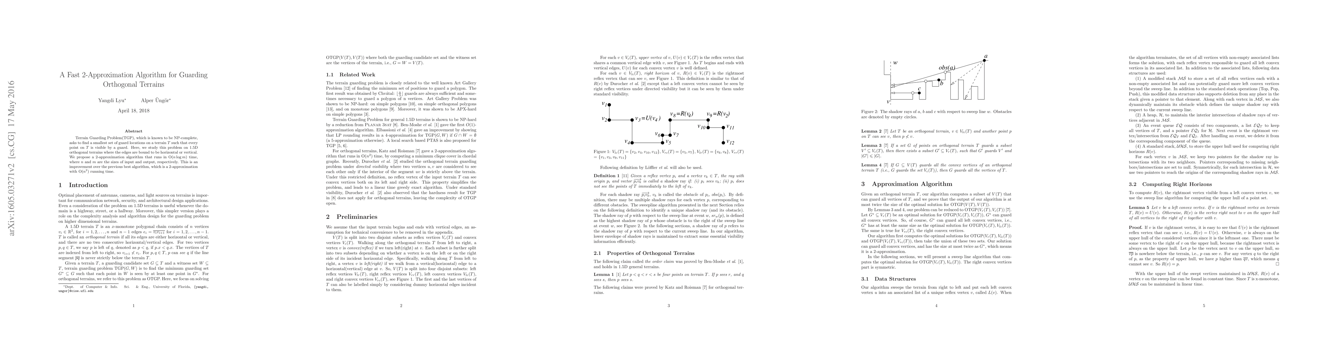 This paper presents a fast 2-approximation algorithm for the NP-complete Terrain Guarding Problem on 1.5D orthogonal terrains, achieving a runtime of O($n \log m$) and improving upon previous O($n^2$) algorithms.