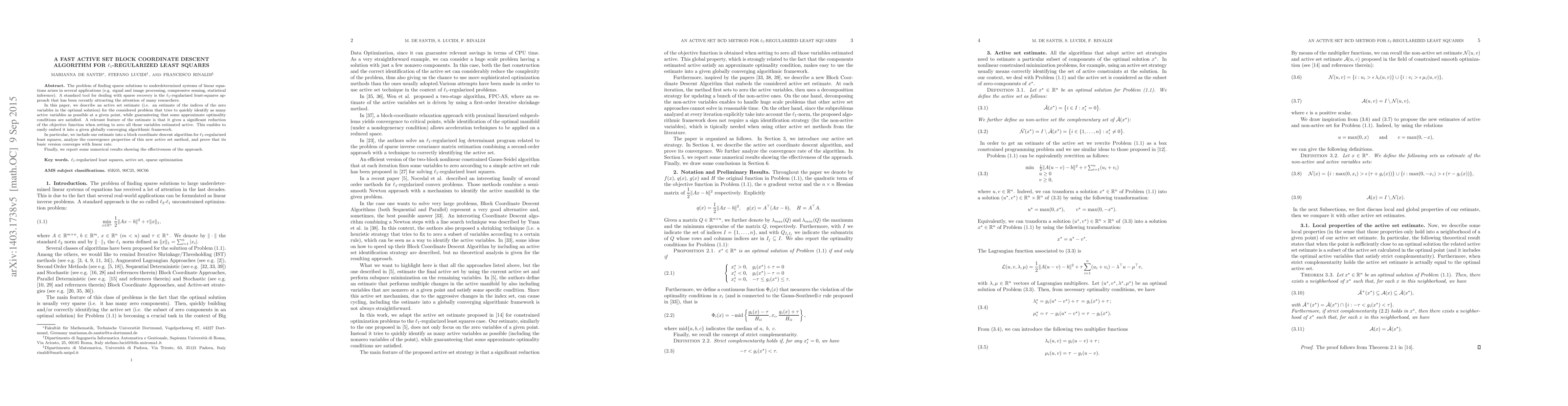 This paper proposes a fast active set block coordinate descent algorithm for solving $\ell_1$-regularized least squares problems, aiming to quickly identify active variables and reduce the objective function. The method is embedded into a block coordinate descent framework, analyzed for convergence, and shown to converge linearly, with numerical results demonstrating its effectiveness.