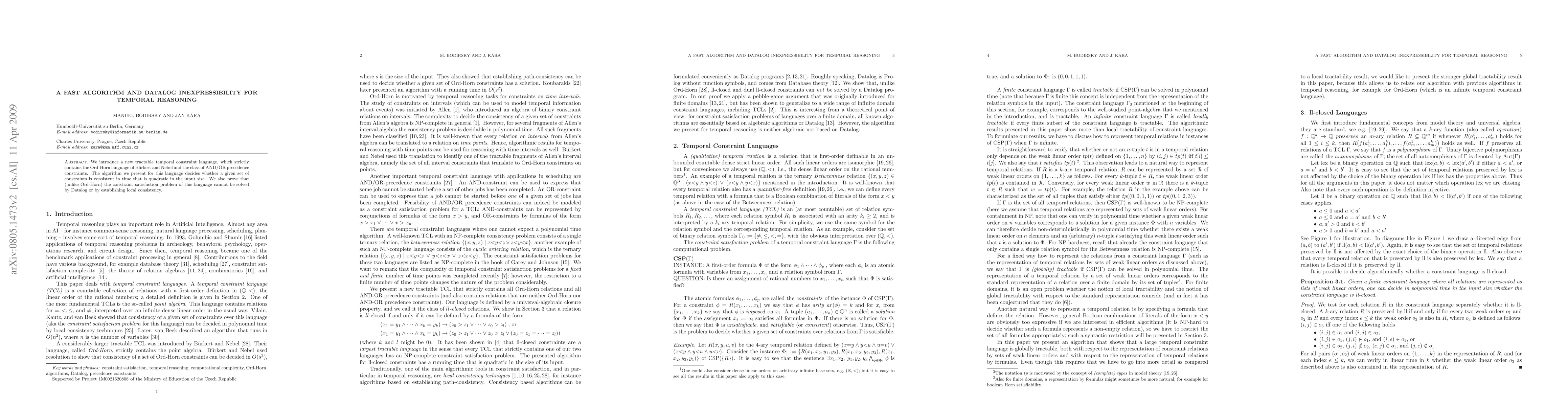 Summary: This paper presents a new efficient temporal constraint language that surpasses Ord-Horn and AND/OR precedence constraints, with a quadratic-time consistency algorithm. It also demonstrates that this language cannot be solved using Datalog or local consistency methods.