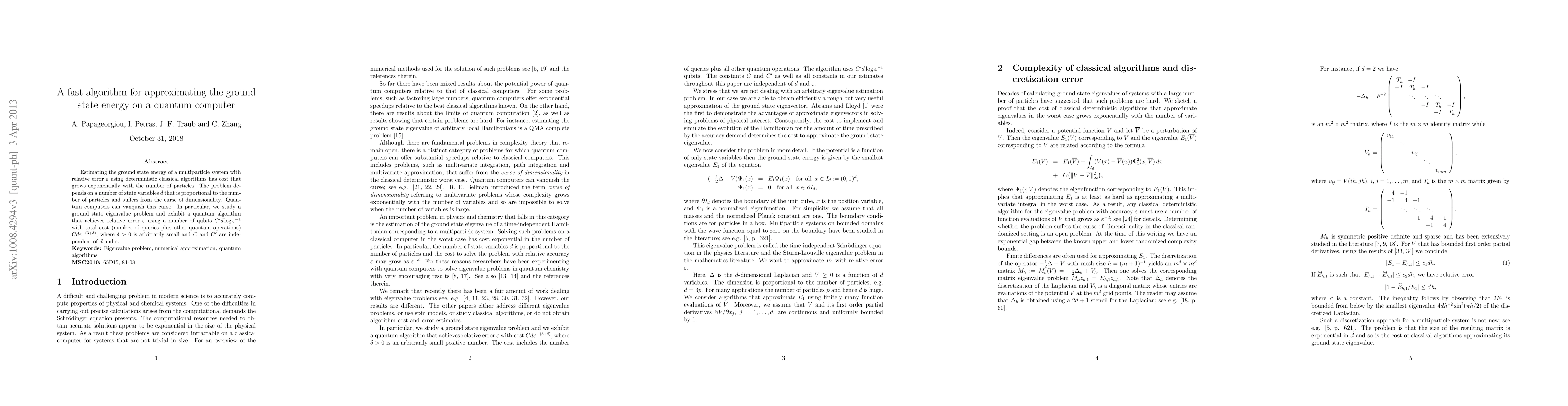 This paper presents a quantum algorithm that significantly reduces the computational cost of estimating ground state energy in multiparticle systems, addressing the classical 'curse of dimensionality'. The algorithm achieves a relative error $e$ using $C'd log e^{-1}$ qubits and a total cost of $Cde^{-(3+delta)}$, where $C$, $C'$, and $delta$ are independent of the system size $d$ and the required error $e$.
