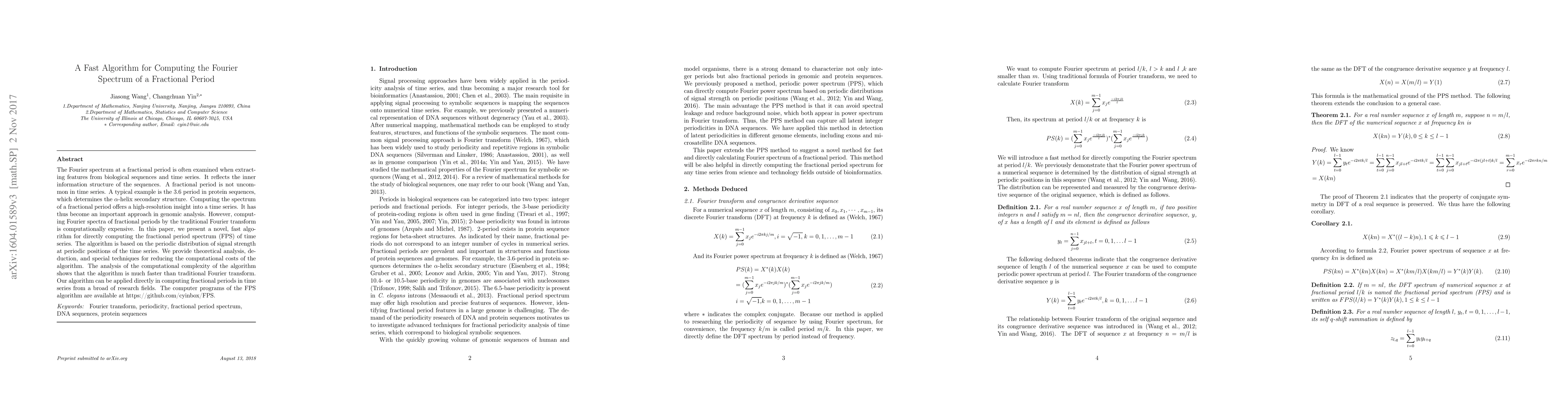 This paper introduces a novel, efficient algorithm for computing the Fourier spectrum of fractional periods in time series, offering high-resolution insights into biological sequences. The proposed algorithm significantly reduces computational costs compared to traditional methods, making it applicable across various research fields.