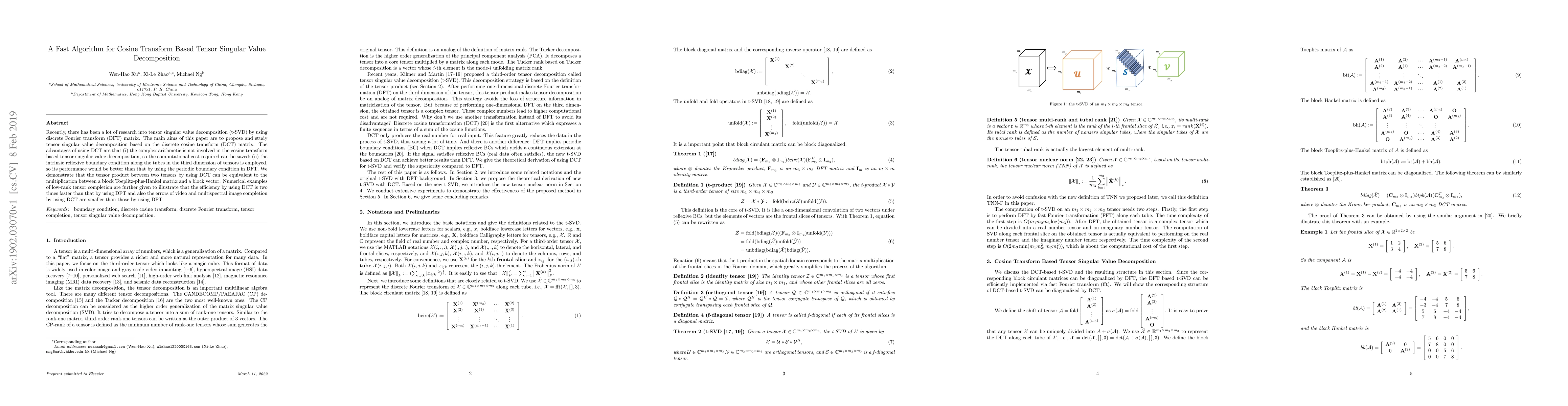 This paper proposes a fast algorithm for tensor singular value decomposition (t-SVD) using the discrete cosine transform (DCT) matrix, highlighting computational savings and improved performance over the discrete Fourier transform (DFT) due to its reflexive boundary condition. Numerical examples show DCT-based t-SVD is twice as fast and results in smaller errors for video and multispectral image completion compared to DFT.