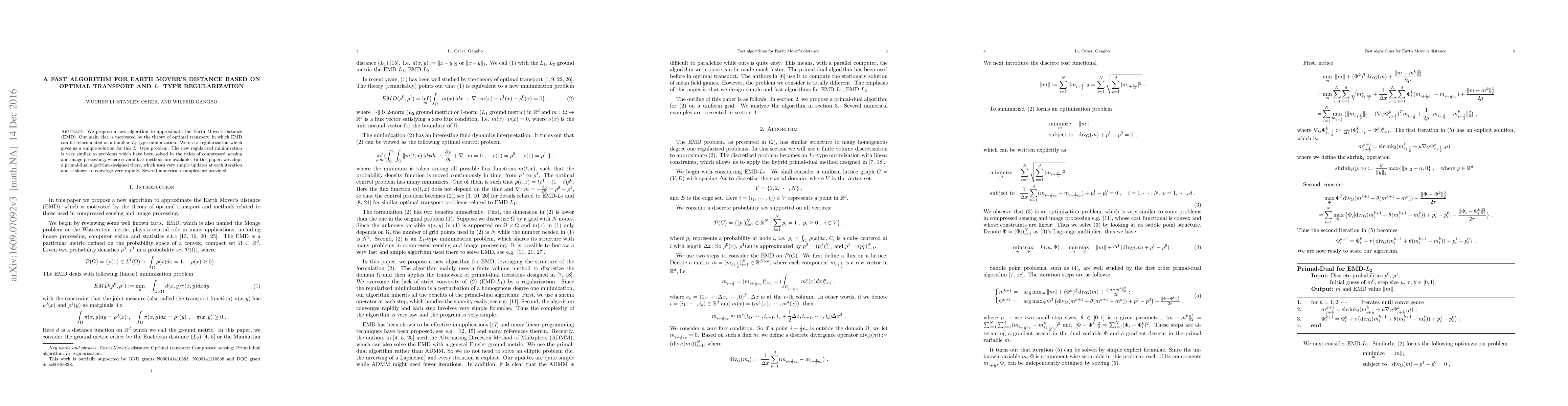 We propose a new algorithm to approximate the Earth Mover's distance (EMD). Our main idea is motivated by the theory of optimal transport, in which EMD can be reformulated as a familiar $L_1$ type minimization. We use a regularization which gives us a unique solution for this $L_1$ type problem. The new regularized minimization is very similar to problems which have been solved in the fields of compressed sensing and image processing, where several fast methods are available. In this paper, we adopt a primal-dual algorithm designed there, which uses very simple updates at each iteration and is shown to converge very rapidly. Several numerical examples are provided.