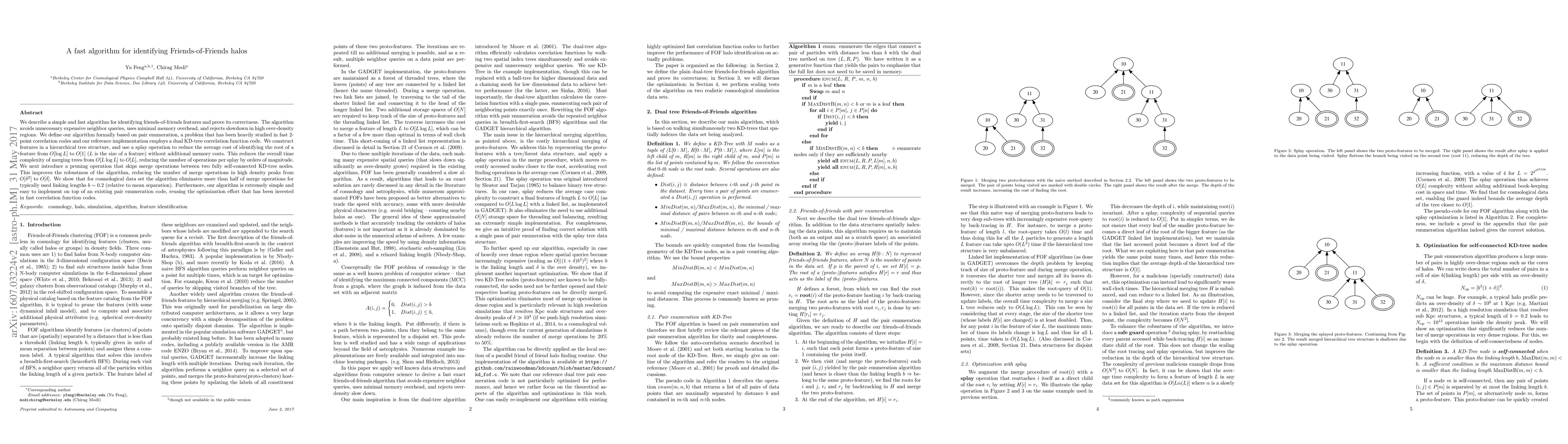 We describe a simple and fast algorithm for identifying friends-of-friends features and prove its correctness. The algorithm avoids unnecessary expensive neighbor queries, uses minimal memory overhead, and rejects slowdown in high over-density regions. We define our algorithm formally based on pair enumeration, a problem that has been heavily studied in fast 2-point correlation codes and our reference implementation employs a dual KD-tree correlation function code. We construct features in a hierarchical tree structure, and use a splay operation to reduce the average cost of identifying the root of a feature from $O[\log L]$ to $O[1]$ ($L$ is the size of a feature) without additional memory costs. This reduces the overall time complexity of merging trees from $O[L\log L]$ to $O[L]$, reducing the number of operations per splay by orders of magnitude. We next introduce a pruning operation that skips merge operations between two fully self-connected KD-tree nodes. This improves the robustness of the algorithm, reducing the number of merge operations in high density peaks from $O[\delta^2]$ to $O[\delta]$. We show that for cosmological data set the algorithm eliminates more than half of merge operations for typically used linking lengths $b \sim 0.2$ (relative to mean separation). Furthermore, our algorithm is extremely simple and easy to implement on top of an existing pair enumeration code, reusing the optimization effort that has been invested in fast correlation function codes.