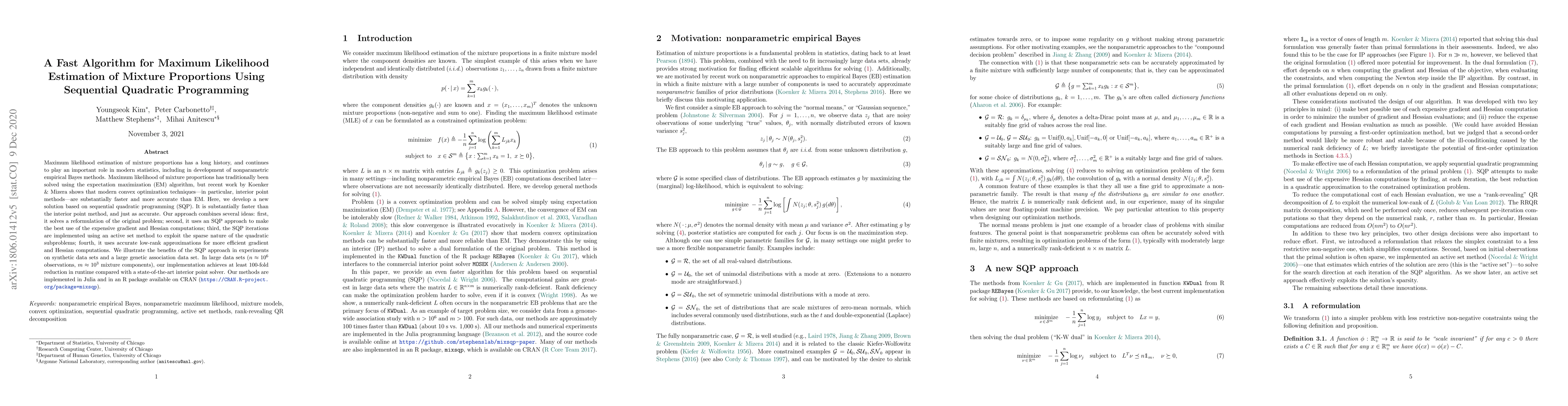Maximum likelihood estimation of mixture proportions has a long history, and continues to play an important role in modern statistics, including in development of nonparametric empirical Bayes methods. Maximum likelihood of mixture proportions has traditionally been solved using the expectation maximization (EM) algorithm, but recent work by Koenker & Mizera shows that modern convex optimization techniques -- in particular, interior point methods -- are substantially faster and more accurate than EM. Here, we develop a new solution based on sequential quadratic programming (SQP). It is substantially faster than the interior point method, and just as accurate. Our approach combines several ideas: first, it solves a reformulation of the original problem; second, it uses an SQP approach to make the best use of the expensive gradient and Hessian computations; third, the SQP iterations are implemented using an active set method to exploit the sparse nature of the quadratic subproblems; fourth, it uses accurate low-rank approximations for more efficient gradient and Hessian computations. We illustrate the benefits of our approach in experiments on synthetic data sets as well as a large genetic association data set. In large data sets (n = 1,000,000 observations, m = 1,000 mixture components), our implementation achieves at least 100-fold reduction in runtime compared with a state-of-the-art interior point solver. Our methods are implemented in Julia, and in an R package available on CRAN (see https://CRAN.R-project.org/package=mixsqp).