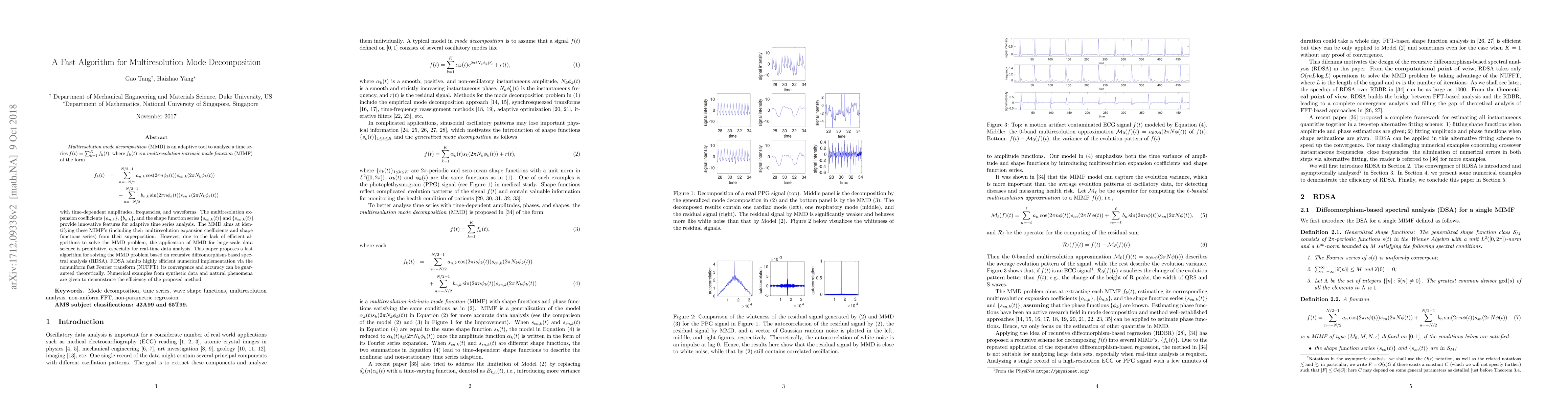 \emph{Multiresolution mode decomposition} (MMD) is an adaptive tool to analyze a time series $f(t)=\sum_{k=1}^K f_k(t)$, where $f_k(t)$ is a \emph{multiresolution intrinsic mode function} (MIMF) of the form \begin{eqnarray*} f_k(t)&=&\sum_{n=-N/2}^{N/2-1} a_{n,k}\cos(2\pi n\phi_k(t))s_{cn,k}(2\pi N_k\phi_k(t))\\&&+\sum_{n=-N/2}^{N/2-1}b_{n,k} \sin(2\pi n\phi_k(t))s_{sn,k}(2\pi N_k\phi_k(t)) \end{eqnarray*} with time-dependent amplitudes, frequencies, and waveforms. The multiresolution expansion coefficients $\{a_{n,k}\}$, $\{b_{n,k}\}$, and the shape function series $\{s_{cn,k}(t)\}$ and $\{s_{sn,k}(t)\}$ provide innovative features for adaptive time series analysis. The MMD aims at identifying these MIMF's (including their multiresolution expansion coefficients and shape functions series) from their superposition. This paper proposes a fast algorithm for solving the MMD problem based on recursive diffeomorphism-based spectral analysis (RDSA). RDSA admits highly efficient numerical implementation via the nonuniform fast Fourier transform (NUFFT); its convergence and accuracy can be guaranteed theoretically. Numerical examples from synthetic data and natural phenomena are given to demonstrate the efficiency of the proposed method.
