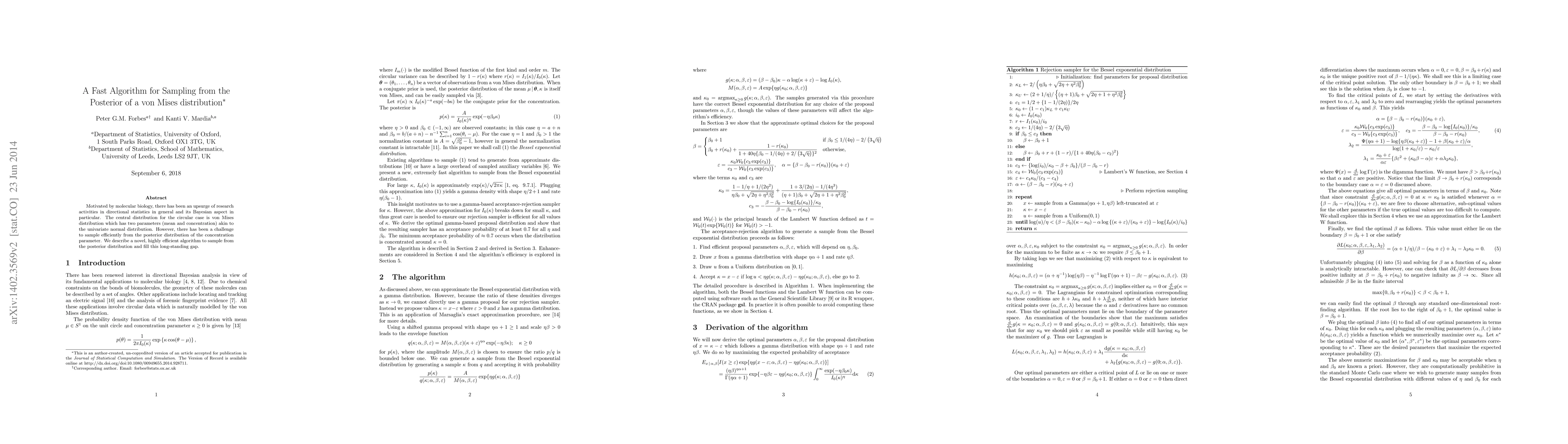 Motivated by molecular biology, there has been an upsurge of research activities in directional statistics in general and its Bayesian aspect in particular. The central distribution for the circular case is von Mises distribution which has two parameters (mean and concentration) akin to the univariate normal distribution. However, there has been a challenge to sample efficiently from the posterior distribution of the concentration parameter. We describe a novel, highly efficient algorithm to sample from the posterior distribution and fill this long-standing gap.