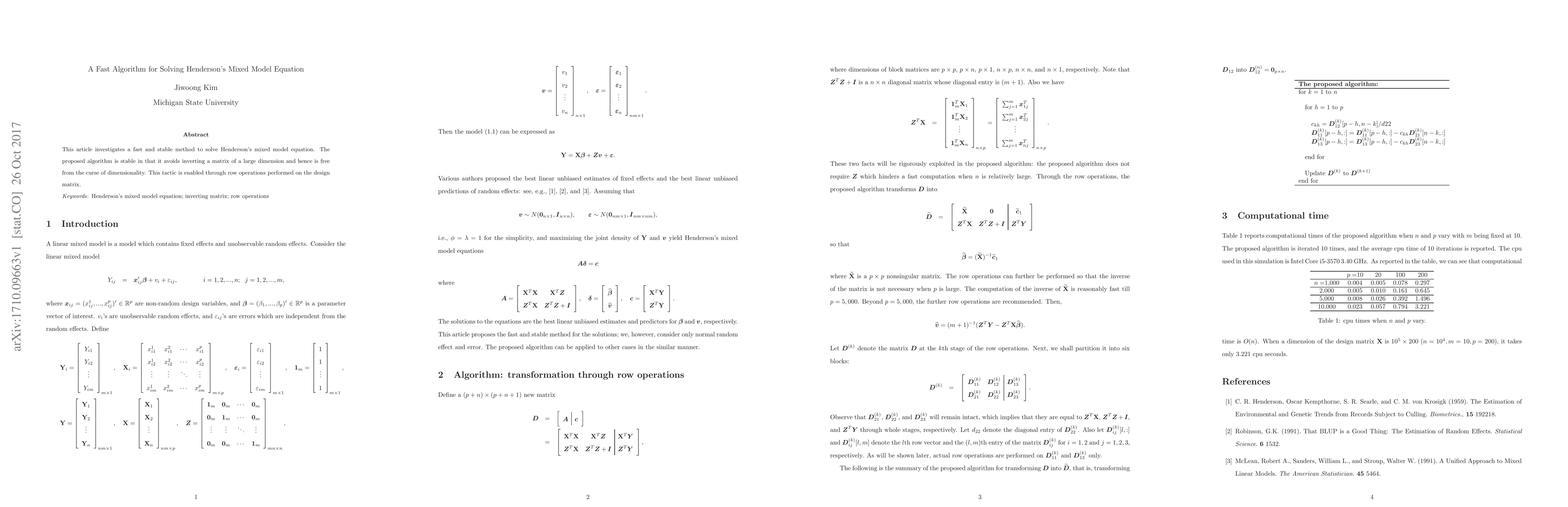 This research paper proposes a fast and stable method to solve Henderson's mixed model equation using row operations on the design matrix, avoiding dimensionality issues.
