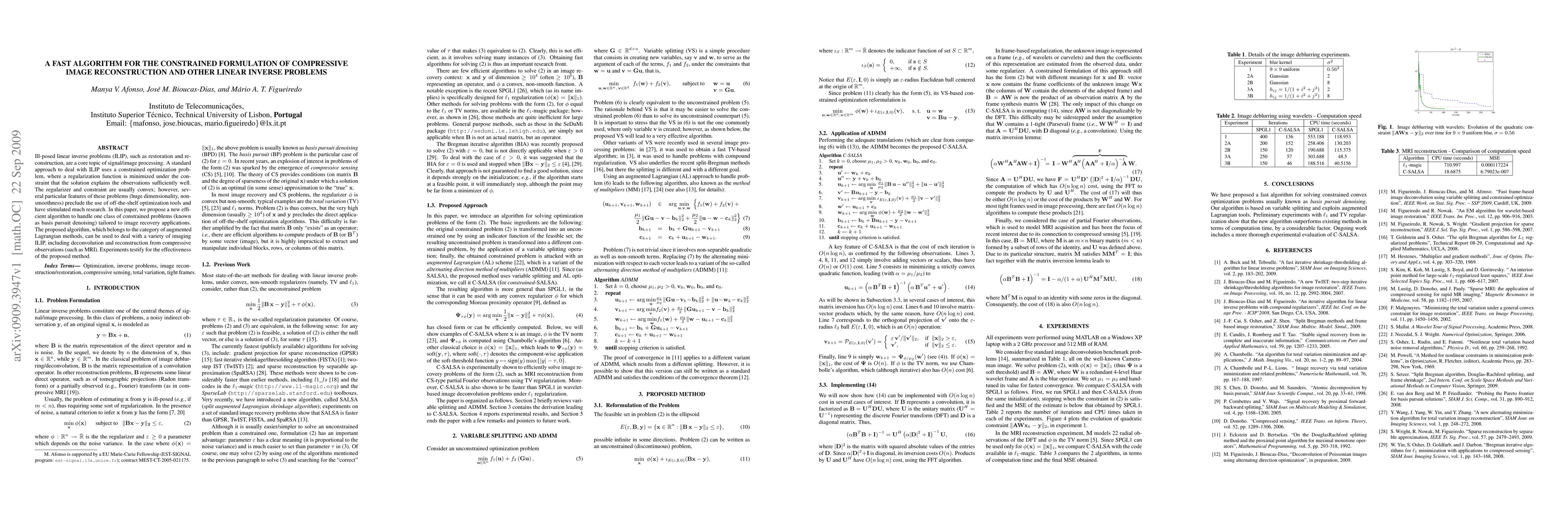 This paper introduces a fast augmented Lagrangian algorithm for solving constrained linear inverse problems, specifically for compressive image reconstruction and related tasks. The proposed method efficiently handles the challenges of dimensionality and non-smoothness, demonstrating effectiveness through experiments.
