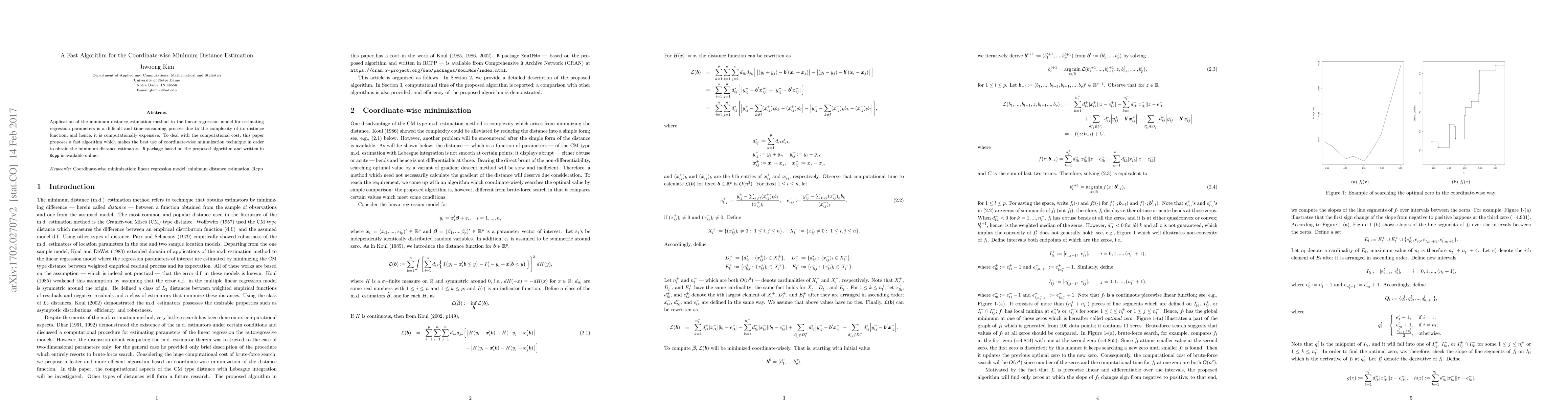 This paper proposes a fast algorithm for estimating regression parameters using the minimum distance method, leveraging coordinate-wise minimization to reduce computational cost. An R package implementing this algorithm is available online.