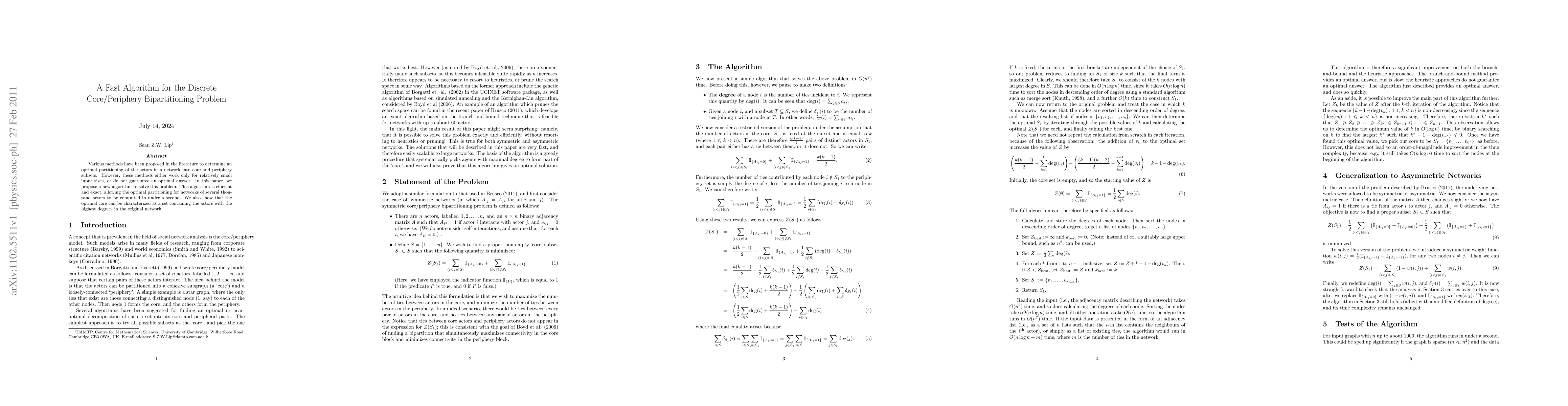 This paper presents a novel, efficient algorithm for optimally partitioning network actors into core and periphery subsets, capable of handling networks with thousands of actors in under a second. The optimal core is identified as comprising actors with the highest degrees in the original network.