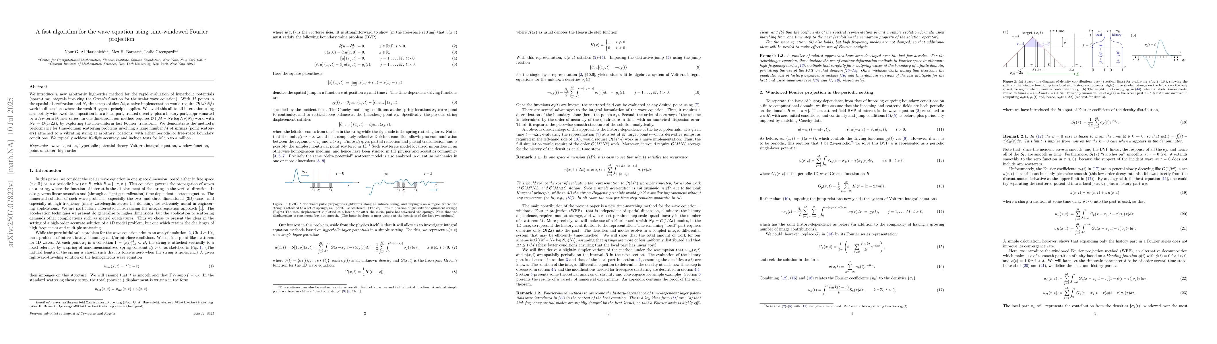 We introduce a new arbitrarily high-order method for the rapid evaluation of hyperbolic potentials (space-time integrals involving the Green's function for the scalar wave equation). With $M$ points in the spatial discretization and $N_t$ time steps of size $\Delta t$, a naive implementation would require $\mathcal O(M^2N_t^2)$ work in dimensions where the weak Huygens' principle applies. We avoid this all-to-all interaction using a smoothly windowed decomposition into a local part, treated directly, plus a history part, approximated by a $N_F$-term Fourier series. In one dimension, our method requires $\mathcal O\left((M + N_F \log N_F)N_t\right)$ work, with $N_F =\mathcal O(1/\Delta t)$, by exploiting the non-uniform fast Fourier transform. We demonstrate the method's performance for time-domain scattering problems involving a large number $M$ of springs (point scatterers) attached to a vibrating string at arbitrary locations, with either periodic or free-space boundary conditions. We typically achieve 10-digit accuracy, and include tests for $M$ up to a million.